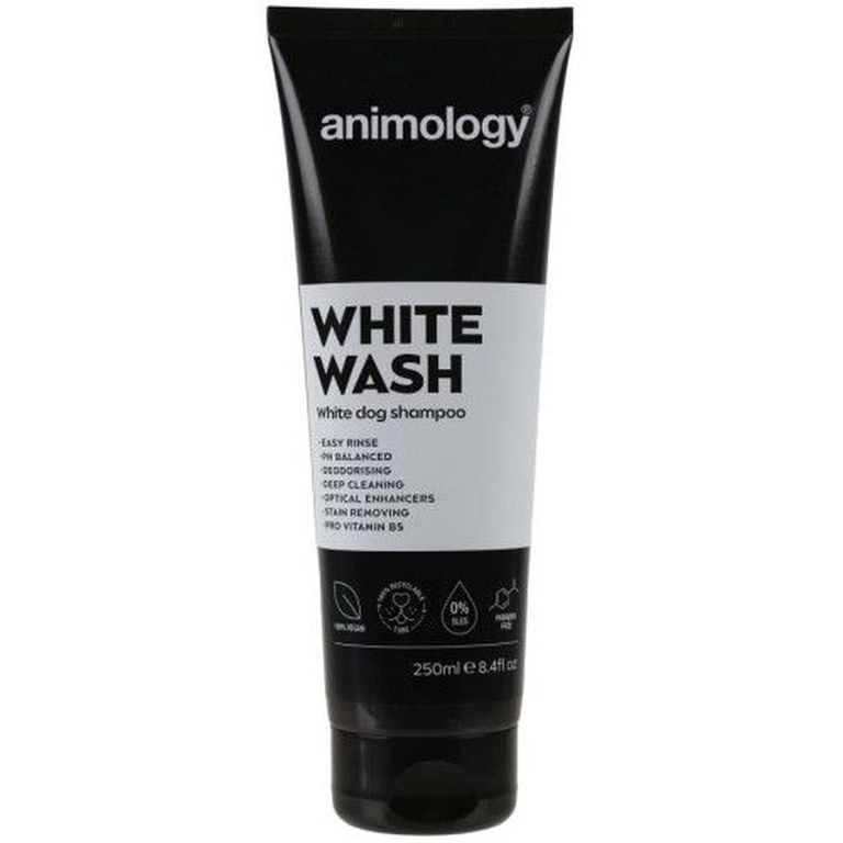 Sampon pentru caini Animology White Wash 250 ml formulat cu potentiatori optici incorporati, care vor ajuta sa lase blana cainelui alb stralucitor, clatire usoara.\nCaracteristici:\n\nFormula 100% vegana este imbogatita cu vitamina B5 si balsam.\n Nu contine sulfati, parabeni sau siliconi.