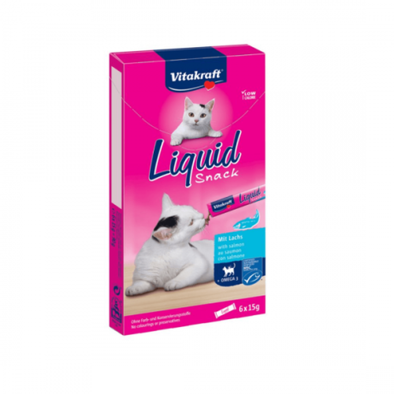 Snack lichid pentru pisici Vitakraft Cat Somon 6x15g PROMO - Gustare lichida pentru pisici de la Vitakraft - o gustare delicioasa si sanatoasa.\nFiecare pachet contine 6 portii care pot fi hranite individual, ca delicatese, sau impreuna cu alimente uscate pentru a incuraja animalul dvs. sa manance alimente uscate.\nCaracteristici si beneficii:\n\nGust irezistibil de somon\nCu omega-3 - benefic pentru o piele sanatoasa si o blana str?lucitoare\nNivel scazut de calorii\nFara coloranti artificiali sau conservanti\nPortii individuale la indemana, astfel incat pisica dvs. sa se poat? bucura in fiecare zi de un gust proaspat si gustos\n\n\n\nFiecare pachet contine 6 plicuri