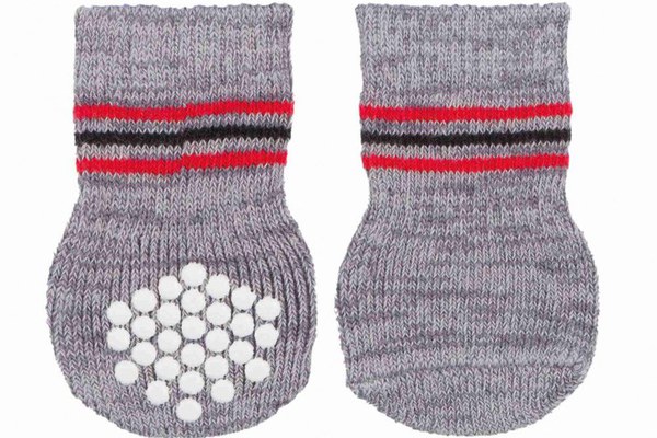 Sosete din bumbac cu elastan\nBaza anti-alunecare datorita punctelor de cauciuc\nPotrivite pentru cainii mai in varsta\nAjuta la protejarea ranilor mai mici\nProtectie pentru podele si mobilier\nCuloare: gri\n\nDimensiune: L-XL\nde exemplu: Ridgeback Rhodesian\nCuloare: gri\nContinut: 2 buc.