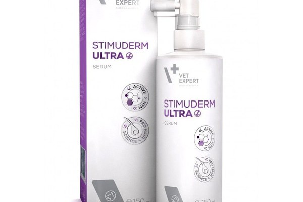 Stimuderm Ultra Serum pentru câini este un dermocosmetic veterinar inovator, recomandat pentru îngrijirea pielii și a blănii in caz de căderea excesivă a blănii de origine diferită și/sau cu de teriorare.Scop: Îngrijirea pielii predispuse la căderea excesivă a părului/ a blănii (inclusiv piele sensibilă, alergică, iritată), care apare de exemplu, în cursul alergiilor, dermatitei atopice, bolilor parazitare (microdermatite, purici, râie), infecțiilor bacteriene și fungice, bolilor hormonale. Alopecie cauzată de deficiențe nutriționale, excoriații, subțierea blanii sau zone complet lipsite de păr, păr slăbit, căde rea excesivă.\nStimuderm Ultra Serum nu înlocuiește tratamentul cauzei principale a pr oblemelor de piele și blănă.Acțiune: Substanța activă a Serului Stimuderm Ultra este molecula patentată ACTIVE NTM, în concentrație crescută. ACTIVE NTM este un ingredient activ cu eficacitate dovedită în stimularea creșterii părului. Active NTM este o moleculă de origine vitaminică, un metabolit activ al vitaminei B3. Induce faza anagenă (creșterea intensivă a părului) și prelungește durata acesteia. Are efect protector asupra foliculului de păr, reducând gradul de distrofie a acestuia. Accelerează creșterea părului, îmbunătățește microcirculația pielii, stimulează regenerarea mai rapidă a foliculilor de păr și intrarea părului în faza anage nă. Concentrația crescută a moleculei ACTIVE NTM în ser, împreună cu substanța de îmbunătățire a permeabilității utilizată în produs (sub formă de glicol vegetal), sporește suplimentar efectul.Alte substanțe active conținute în Stimuderm Ultra Serum susțin mecanismele naturale de protecție ale pielii, hrănesc, regenerează și întăresc părul (beta-glucan de ovăz), au efect calmant (pantenol), precum și hidratant și de netezire (proteinele de mătăse). pH-ul Stimuderm Ultra Serum este apropiat de pH-ul fiziologic al pielii câinelui (aprox. 7).Produsul nu contine SLS/SLES, parabeni, parfumuri, coloranti. Este potrivit pentru pielea sensibilă.