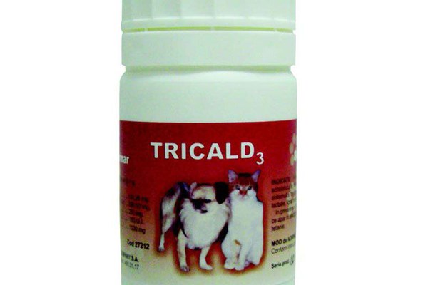 TRICALD 3 x80 Comprimate - Supliment nutritiv pentru combaterea hipocalcemiilor, promotor de creştere si tonic general pentru caini si pisici.\nCOMPOZIŢIE\n\nPentru comprimatele de 1g: Carbonat de calciu 133,3 mg; Fosfat monocalcic (conţine65,6 mg fosfor) 266,6 mg; Gluconat de calciu 200 mg; Vitamina D3 100 UI; Excipienţi(amidon, aerosil, lactoză, PVP K30, CMC, talc, stearat de magneziu, avicel) până la 1000 mg\nPentru comprimatele de 2,5 g: Carbonat de calciu 333,25 mg; Fosfat monocalcic(conţine 65,6 mg fosfor) 666,50 mg; Gluconat de calciu 500 mg; Vitamina D3 250 UI;Excipienţi (amidon, aerosil, lactoză, PVP K30, CMC, talc, stearat de magneziu, avicel)până la 2500 mg\n\nACŢIUNE FARMACOLOGICĂ\n\nCalciul sub formă de ioni provenit din cele trei surse de calciu, este indispensabilorganismului pentru desfăşurarea normală a proceselor fiziologice, ducând la intensificareaosteosintezei, tonifierea neuromusculară, stimularea fagocitozei şi a coagulării sângelui.\nIonul de calciu este necesar formării scheletului, dinţilor şi previne rahitismul la tineret.\nVitamina D3 asigură absorbţia intestinală a calciului şi fosforului precum şi fixarealor în oase. Este indispensabilă pentru funcţia reglatoare aparathormonului (echilibrul fosfor-calciu).\n\nSPECII ŢINTĂ: Câini si pisici.\nINDICAŢII\n\nPentru dezvoltarea armonioasă a scheletului la tineretul caninşi felin precum şi pentru reechilibrarea sistemului de electroliţi lafemelele în gestaţie şi lactaţie.\nAcţionează ca tonic general.\nÎn prevenirea şi în tratamentul deficienţelor de calciu ce apar înafecţiuni ca: rahitism, crampe musculare, tetanie.\n\nCONTRAINDICAŢII: Ulcer gastro-duodenal, litiază renală şi hipercalcemie.\nREACŢII ADVERSE: Administrarea îndelungată a produsului poate să ducă lahipercalcemie sau depunerea calciului în ţesuturile moi.\nMOD DE ADMINISTRARE\nTricald3 se administrează pe cale orală, în următoarele doze zilnice:\n\ncâini sub 5 kg: 1 comprimat de 1 g/2 kg greutate corporală;\ncâini peste 5 kg: 3 comprimate de 1 g/10 kg greutate corporală sau 1 comprimat de2,5 g/10 kg. greutate corporală.\ncăţele în perioada de gestaţie şi lactaţie: 1 comprimat de 1 g/10 kg greutate corporală\npisici: 1 comprimat de 1 g/2 kg greutate corporală\n\nDurata tratamentului este de minim 10 zile/lună, mai multe luni la rând în funcţie de stareafiziologică şi evoluţia clinică a animalului.\nTricald3 se administrează pe cale orală, ca atare sau mărunţit şi introdus în hrană.\nATENŢIONĂRI: Nu sunt\nMOD DE PREZENTARE\n\nFlacoane de polietilenă cu 20, 50, 80 comprimate de 1 g.\nFlacoane de polietilenă cu 30 sau 100 comprimate de 2,5g.