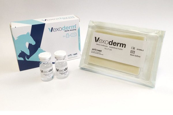 Vexoderm este un pansament de plaga de generatie noua ce curata si detoxifica plaga. Designul sau inovativ este rezultatul a ani de cercetare a stresului oxidativ. Vexoderm combina 2 componente de origine naturala pentru o ingrijire optima a plagii.\na. Matrice liofilizata de origine vegetala 100% cu capacitate mare de absorbtie.b. Solutie de hidratare cu proprietati hidratante si antioxidante\nBeneficiile importante:\na. Pentru animal:\n\nDetoxifica exsudatul plagii\nNeutralizeaza excesul de specii reactive de oxigen in mediul plagii\nGestioneaza exsudatul\nCapacitate de absorbtie de 20 ori greutatea sa uscata\nReduce iritatia si disconfortul\n\nb. Pentru medicul veterinar:\n\nAdaptabil si usor de aplicat si de indepartat\nNu adera la plaga\nO schimbare la fiecare 7 zile\n\nVexoderm poate fi folosit in aproape toate tipurile de plagi: politraumatisme (taieturi, abraziuni, arsuri), necroze, ulceratii, plagi chirurgicale si dehiscente ale ranilor.\nAdaptabil pentru utilizare pe multe zone ale ranilor.\nEste disponibil in 2 dimensiuni: 9x4 cm si 10x7 cm.