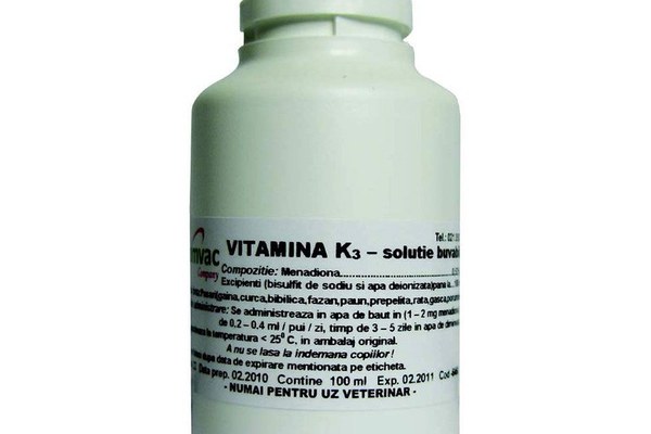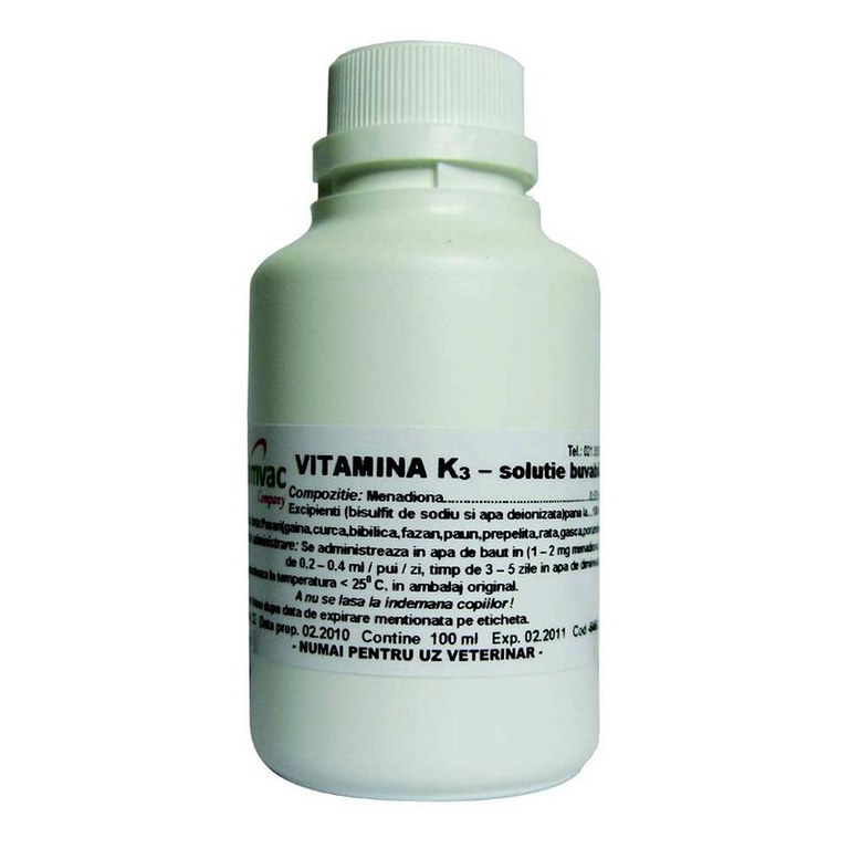VITAMINA K3 Buvabila 100 ml - Soluţie buvabilă, supliment vitaminic cu diateze hemoragice consecutive unor boli infecţioase, parazitare sau intoxicaţii la pasari.\nCOMPOZIŢIE: Menadionă (2 metil 1-4 naftochinonă) 0,525 g; Bisulfit de sodiu 1,3 g; Apă distilată până la 100 ml.\nACŢIUNE FARMACOLOGICĂ \n\nVitamina K3 joacă un rol important în sinteza protrombinei hepatice şi în procesul de coagulare, având astfel un puternic efect antihemoragic; acţionează asupra endoteliilor capilare şi asupra fibrinogenului.\nCarenţa de vitamina K3 determină hemoragii şi hipoprotrombinemie.\nÎn doze mari vitamina K3 activează sistemul reticulohistiocitar, produce diureză (atunci când exista edeme generale), stimulează funcţiile ficatului şi ale măduvei oaselor.\n\nSPECII ŢINTĂ: Păsări (găină, curcă, bibilică, prepeliţă, fazan, păun, raţă, gâscă, porumbel).\nINDICAŢII \n\nSe recomandă ca supliment vitaminic la pui cu diateze hemoragice consecutive unor boli infecţioase, parazitare sau intoxicaţii.\nSe recomandă în sindromul hemoragic la pui şi la tineretul aviar supus tratamentelor prelungite cu sulfamide sau antibiotice, precum şi ca adjuvant în coccidioză.\n\nCONTRAINDICAŢII: Nu există.\nREACŢII ADVERSE: Nu s-au constatat, în condiţiile în care s-au respectat dozele recomandate. În caz de supradozare se pot produce tulburări hepatice şi renale.\nMOD DE ADMINISTRARE \n\nSe administrează în apa de băut în doză de 0,2-0,4 ml Vitamina K3 (1-2 mg menadionă) pe pui/zi, timp de 3-5 zile.\nSe administrează în masă, în apa de băut de dimineaţă, calculând volumul soluţiei în funcţie de numărul puilor.\n\nATENŢIONĂRI: A se respecta doza de vitamină recomandată.\nTIMP DE AŞTEPTARE: Nu este cazul