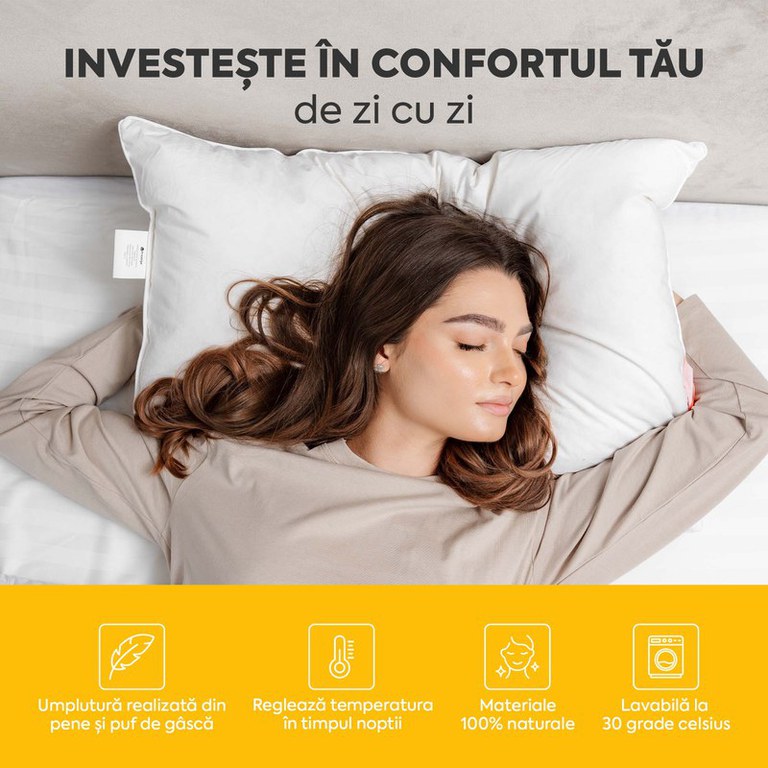 INVESTEȘTE ÎN CONFORTUL TĂU DE ZI CU ZI Cu o umplutură realizată din pene și puf de gasca, Perna Deluxe este incredibil de moale și pufoasă, oferind o experiență de somn ca la un hotel de 5 stele. În fiecare noapte te relaxezi în îmbrățișarea materialelor 100% naturale, care îți vor garanta un somn profund. HUSA 100% DIN BUMBAC Fabricata din bumbac de cea mai bun calitate, husa pernei iti ofera un somn linistitor in fiecare noapte. Aceasta permite circulația optimă a aerului, nu provoacă alergii și nu acumulează electricitate statică. Datorită proprietăților sale, bumbacul este un material utilizat de secole atunci cand vine vorba de produsele pentru somn. REGLEAZA IN MOD NATURAL TEMPERATURA SI VA OFERA UN SOMN AERISIT Penele și puful creează un climat de somn plăcut, fără a provoca transpirații nocturne. Datorita materialelor 100% naturale, Perna Deluxe ofera o respirabilitate mai ușoară, mai puține transpirații nocturne și relaxarea completă a corpului, beneficii esentiale pentru un somn adanc. DE CE SA O ALEGI? Succesul unei perne grozave este umplutura. Perna Deluxe iti ofera cea mai buna combinatie dintre puful si penele de gasca. Umplutura nu acumulează umezeală și transpirație si astfel nu vei avea parte de mirosuri neplacute. De asemenea, perna este ușoară, moale și permite circulația optimă a aerului. PERNA LAVABILA LA 30°C Pentru o igiena sporita, perna poate fi spălată complet la 30 °C. Este foarte important sa usuci perna cat mai repede posibil, pentru care îți recomandăm să folosești un uscător de rufe. SPECIFICATII PRODUS Dimensiuni: 50 x 70 cm Material husă: 100% bumbac Material interior: 1000g umplutura din puf si pene de gasca