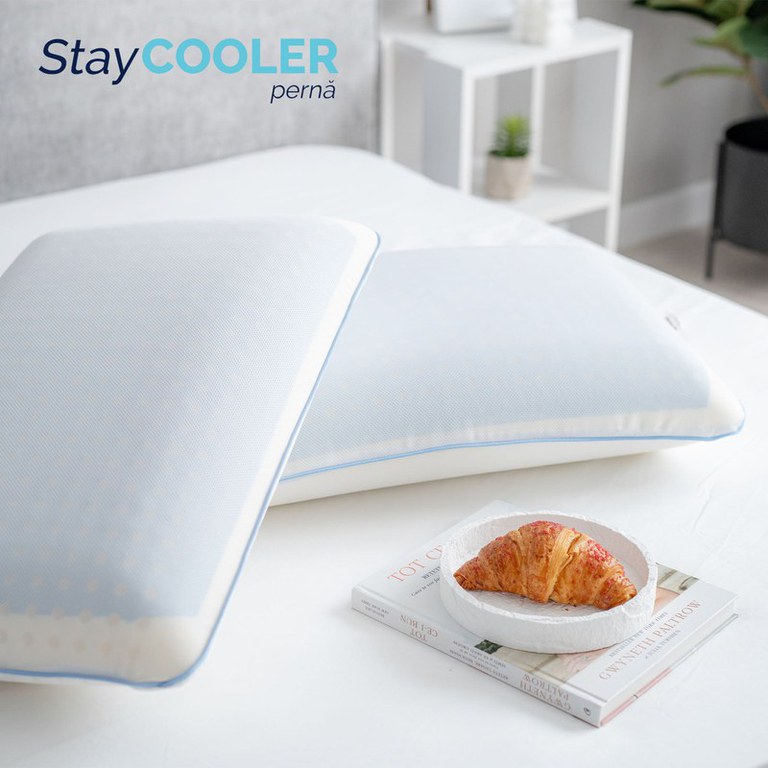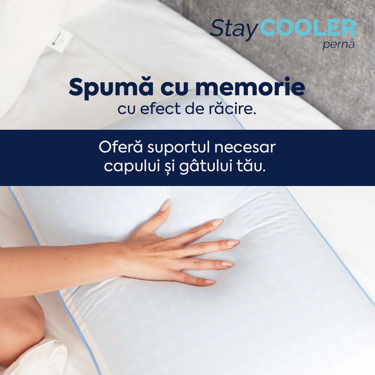 SUPORT UNIVERSAL ȘI RELAXARE ÎN FIECARE NOAPTE Perna Stay Cooler oferă cel mai bun sprijin punctelor de presiune de sub umeri, gât și cap pentru cea mai corectă aliniere a vertebrelor de la gât și coloana vertebrală. Gâtul tău este în poziția corectă în fiecare moment al nopții și dormi profund și fără dureri până dimineață. SPUMĂ CU MEMORIE CU EFECT DE RĂCIRE Spuma cu memorie elastică Viscolex conține un gel cu efect revigorant pentru o senzație plăcută de răcoare și prospețime. Infuzia cu gel reacționează la temperatura corpului absorband căldura pe tot parcursul nopții. GATA CU TRANSPIRAȚIILE DIN TIMPUL NOPȚII Husa este realizată dintr-un material respirabil cu densitatea de 145g/m2 ce reduce semnificativ transpirația pe timpul somnului. Spuma cu memorie cu perforații Viscolex împreună cu tehnologia cu gel cu efect de răcire previne transpirația nocturnă oferindu-ți o senzație plăcuta de răcoare și prospețime. PERNĂ UNIVERSALĂ PENTRU TOATE POZIȚIILE DE DORMIT. Perna se adaptează perfect corpului tău și o poți folosi pentru orice poziție de dormit: pe lateral, pe spate sau pe burtă. În fiecare noapte, corpul tău va fi în poziția corectă pentru ca tu să te bucuri de un somn profund. HUSĂ DETAȘABILĂ ȘI LAVABILĂ. Compoziția interioară a pernei Stay Cooler prezintă un înveliș elastic pentru o protecție superioară. De asemenea, pentru o igienă sporită, husa este detașabilă și lavabilă la 30 de grade Celsius. INSTRUCȚIUNI DE SPĂLARE. Nu folosiți înălbitor. A nu se usca la uscător. A nu se folosi fierul de călcat pentru uscare și călcare. A se spăla doar husa la 30 de grade Celsius. RECOMANDĂRI DE UTILIZARE. Perna trebuie utilizată întotdeauna cu lenjerie (acoperită cu o husă), aceasta având rol de protecție. Acest produs se utilizează în spații închise, într-un climat normal de umiditate și temperatură. Se recomandă aerisirea săptămânală a încăperii, baterea și scuturarea pernei și expunerea produselor la aer curat, astfel se previne dezvoltarea mucegaiului și acumularea unei mari concentrații de umiditate în produse. Produsul nu este destinat folosirii în medii umede. Evitați scurgerea de lichide și acumularea de umezeală în produse. Se recomandă curățarea conform informațiilor de pe eticheta atașată, evitați călcarea și uscarea cu fierul de călcat. Specificații Produs: Dimensiuni: 60x40x15 cm Material husă: poliester cu densitatea de 145 g/m2 Material interior: spumă cu memorie cu densitatea de 38 kg/m3