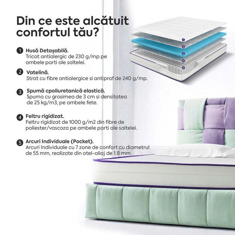 O PRIVIRE ÎN INTERIORUL SALTELEI 1. Husa Detașabilă. Tricot antialergic de 230 g/mp pe ambele părți ale saltelei. 2. Vatelină. Strat cu fibre antialergice și antipraf de 240 g/mp 3. Spumă poliuretanică elastică. Spumă cu grosimea de 3 cm și densitatea de 25 kg/m3, pe ambele fețe. 4. Feltru rigidizat. Feltru rigidizat de 1000 g/m2 din fibre de poliester/vascoza pe ambele părți ale saltelei 5. Arcuri Individuale (Pocket) Arcuri Individuale cu 7 zone de confort cu diametrul de 55 mm, realizate din oțel-aliaj de 1.8 mm CURATĂ CA ÎN PRIMA ZI Husa ta preferată poate fi acum curățată cu ușurință. Husa cu fermoar, detașabilă și lavabila la 30°C, asigură o igienă maximă pentru patul tău. SOMN IGIENIC ȘI ODIHNITOR Cu materiale certificate de Oeko-Tex și Certipur, salteaua noastră iți oferă un mediu de dormit sigur și igienic, respectând cele mai înalte standarde de calitate și protecție a mediului. ADAPTABILĂ NEVOILOR TALE Arcurile Individuale pe 7 zone ale saltelei noastre asigură o adaptare optimă la forma corpului tău, pentru o senzație de confort desăvârșit. Această tehnologie unică permite ca salteaua să nu facă zgomot și să nu te deranjeze în timpul somnului. LA FEL DE RELAXANTĂ ÎN ORICE POZIȚIE Indiferent de poziția în care dormi, salteaua noastră este proiectată pentru a-ți oferi confort și suport optim pentru coloana vertebrală, reducând astfel riscul de dureri și probleme de postură în timpul somnului. FARĂ DURERI DE SPATE Cu această saltea, vei experimenta un suport ergonomic care ajută la menținerea unei coloane vertebrale sănătoase și fără dureri. Indiferent de poziția ta de dormit preferată, această saltea îți oferă suportul necesar pentru un somn odihnitor și pentru a te trezi fără dureri sau disconfort. Designul său inovator asigură o distribuție uniformă a greutății și elimină punctele de presiune, astfel încât să poți să te relaxezi și să dormi profund fără să simți că te afunzi în saltea. Întreținere: Evitați umezirea saltelei. Nu se recomandă curățarea umedă și uscarea cu fierul de călcat. Este recomandat să protejați salteaua cu o husă. Se recomandă aerisirea zilnică a încăperii și expunerea saltelei la aer curat. Este bine ca saltelele să fie întoarse o dată la trei luni pentru a asigura uzura uniformă, inversând zona superioară (de cap) cu cea inferioară (de picioare). P.S. Pentru un somn de neuitat, vă recomandăm și achiziționarea unui topper. Inaltimea corecta a saltelei se poate masura la un interval de 48 ore de la desfacerea ei din ambalaj si asezarea ei, pe orizontala, pe o suprafata plana. *Imaginile produselor prezentate pe site sunt cu titlu de prezentare și pot diferi în orice mod (culoare, aspect etc.) de imaginile produselor livrate, acestea putând prezenta abateri de la pozele și descrierile prezentate pe site.