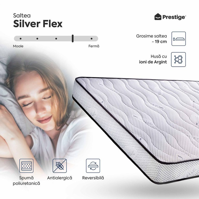 Saltea SILVER FLEX, spumă poliuretanică, reversibilă, hipoalergenică, super ortopedică, Grosime 19 cm