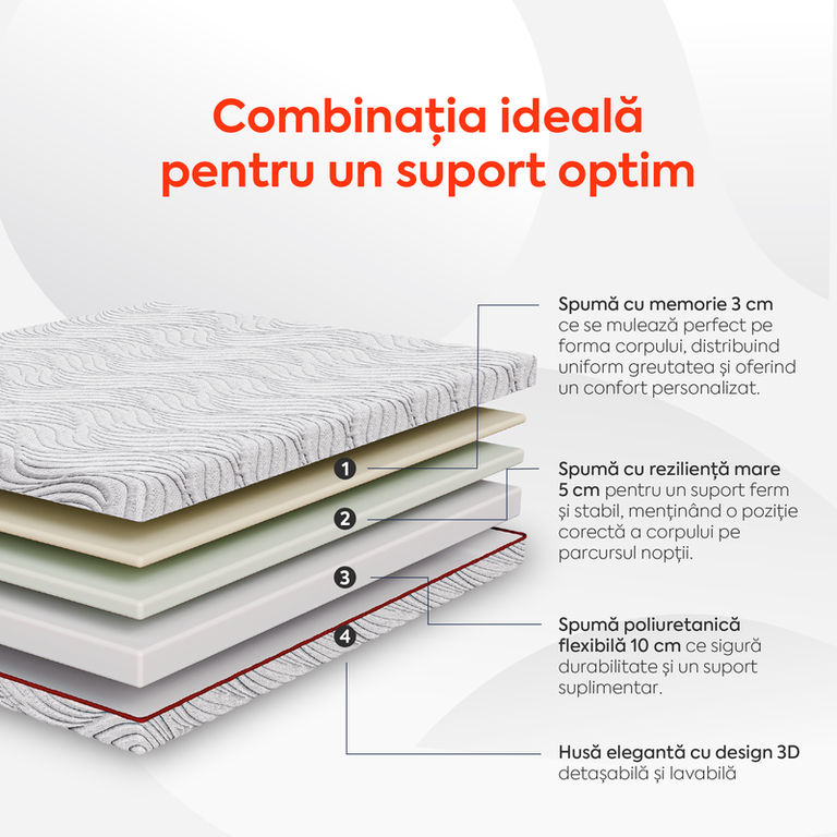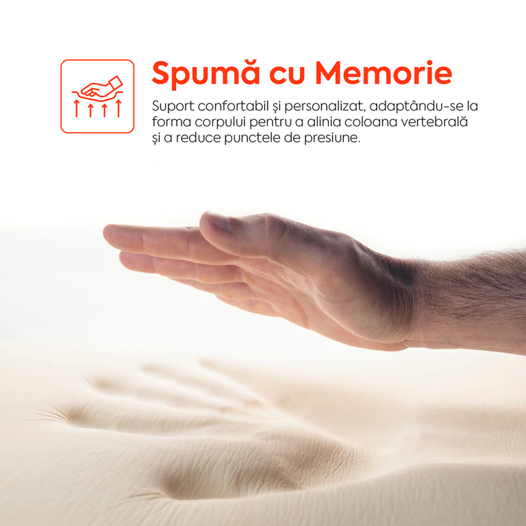 Îmbunătățește-ți somnul cu salteaua noastră elegantă, cu husă 3D hipoalergenică, termoregulatoare și antiperspirantă. Fără arcuri, este complet silentioasă și previne transferul de mișcare, astfel încât nu îți vei deranja partenerul. Stratul din spumă cu memorie se adaptează perfect formei corpului, iar stratul de suport asigură durabilitate pe termen lung. Husa detașabilă și lavabilă oferă nu doar confort, ci și o întreținere ușoară, păstrând un mediu de somn sănătos. STRUCTURA SALTELEI: Salteaua cu trei straturi oferă un echilibru ideal între confort, suport și durabilitate. Stratul de confort din spumă cu memorie se adaptează la forma corpului, asigurând o relaxare optimă. Stratul de tranziție, din spumă cu reziliență mare, oferă suport suplimentar și previne deformarea, iar stratul de suport din spumă poliuretanică flexibilă stabilizează salteaua și contribuie la menținerea unei poziții corecte a corpului pe termen lung. 1. Strat confort: spumă cu memorie 3 cm Se mulează perfect pe forma corpului, distribuind uniform greutatea și oferind un confort personalizat. 2. Strat de tranziție: spumă cu reziliență mare 5 cm Are o capacitate excelentă de a reveni la forma inițială după ce este comprimată sau presată, adică nu se deformează ușor. 3. Strat de suport: spumă poliuretanică flexibilă 10 cm Asigură durabilitate și un suport suplimentar. Aceasta stabilizează salteaua și îi prelungește durata de viață, fiind o alegere excelentă pe termen lung. 4. Husă elegantă cu design 3D Husa este hipoalergenică și poate fi detașată și spălată la 30°C, pentru o igienă impecabilă și o întreținere ușoară. SPUMĂ CU MEMORIE Unul dintre cele mai importante avantaje este reducerea semnificativă a punctelor de presiune. Atunci când corpul se află într-o poziție statică, anumite zone, precum umerii, șoldurile și spatele, pot suferi din cauza presiunii continue, ceea ce duce la disconfort și chiar dureri pe parcursul nopții. Spuma cu memorie se mulează pe conturul corpului, distribuind greutatea uniform și eliberând aceste puncte de presiune, ceea ce poate reduce riscul de dureri musculare sau articulare. SPUMĂ REZILIENȚĂ MARE (HR) Spuma cu reziliență mare este alegerea ideală pentru cei care își doresc un produs durabil, confortabil și performant pe termen lung. Datorită capacității sale excepționale de a reveni la forma inițială după ce este comprimată sau presată, această spumă nu se deformează în timp, asigurând fermitate și flexibilitate chiar și în condiții de utilizare intensivă. Spuma își păstrează proprietățile pentru o perioadă îndelungată, oferind un suport constant și confortabil. Aceasta ajută la menținerea unei alinieri corecte a coloanei vertebrale, contribuind astfel la reducerea disconfortului și a durerilor cauzate de pozițiile incorecte în timpul somnului. Vei beneficia de un somn mai odihnitor, fără întreruperi, fiind o alegere excelentă pentru cei care vor să investească într-un produs de calitate superioară care oferă atât confort, cât și sprijin pe termen lung. CALITATE CERTIFICATĂ Husa este certificată Oeko-Tex, garantând că materialele utilizate sunt sigure pentru sănătatea ta și nu conțin substanțe dăunătoare. Certificarea CertiPUR garantează că spuma utilizată este fabricată fără substanțe dăunătoare, fiind testată pentru siguranța, durabilitate și performanță, oferind astfel un produs sigur pentru sănătatea consumatorilor. SUSȚINERE OPTIMĂ Salteaua este superortopedică, concepută pentru a oferi un suport optim și o aliniere corectă a coloanei vertebrale, esențială pentru un somn sănătos. Aceasta asigură un echilibru perfect între fermitate și confort, contribuind la reducerea punctelor de presiune, ceea ce ajută la prevenirea durerilor de spate și gât. HUSĂ DETAȘABILĂ ȘI LAVABILĂ Husa saltelei este realizată din tricot premium, oferind atât un aspect elegant, cât și o protecție eficientă pentru saltea. Designul său sofisticat în nuanțe de gri adaugă un plus de stil, fiind perfectă pentru orice dormitor modern. Este detașabilă și lavabilă, asigurând o igienă optimă și o întreținere ușoară, pentru un somn curat și sănătos în fiecare noapte. INSTALAREA SALTELEI ESTE SIMPLĂ ȘI RAPIDĂ. Toate saltelele noastre sunt comprimate și sigilate în vid datorită procesului de livrare ecologic și protecției pe parcursul transportului. Noua ta saltea este transportată sub formă de rolă comprimată si vidată. INTREȚINERE: Evitați umezirea saltelei. Husa este detașabilă și lavabilă la 30°C. A nu se folosi înalbitor. A nu se usca la uscător. Nu se recomandă curățarea umedă și uscarea cu fierul de călcat. Este recomandat să protejați salteaua cu o husă. Se recomandă aerisirea zilnică a încăperii și expunerea saltelei la aer curat. Este bine ca saltelele să fie întoarse o dată la trei luni pentru a asigura uzura uniformă, inversând zona superioară (de cap) cu cea inferioară (de picioare). P.S. Pentru un somn de neuitat, vă recomandăm și achiziționarea unui topper. Inaltimea corecta a saltelei se poate masura la un interval de 48 ore de la desfacerea ei din ambalaj si asezarea ei, pe orizontala, pe o suprafata plana. *Imaginile produselor prezentate pe site sunt cu titlu de prezentare și pot diferi în orice mod (culoare, aspect etc.) de imaginile produselor livrate, acestea putând prezenta abateri de la pozele și descrierile prezentate pe site.