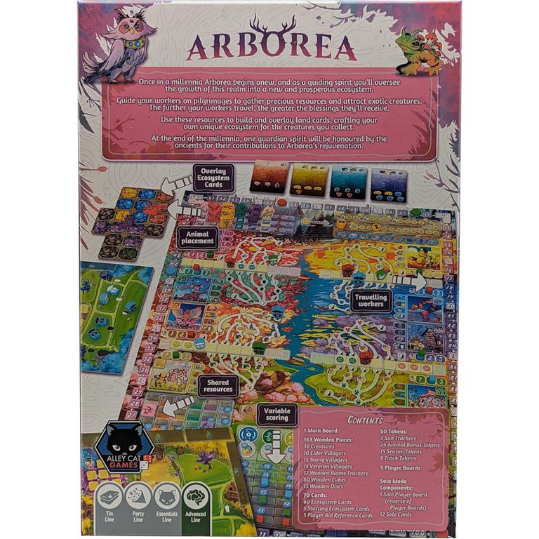 Arborea este un joc de tip euro de plasare a muncitorilor in care timpul si planificarea in avans reprezinta cheia succesului. In timpul jocului, participantii vor plasa muncitori pe piste de actiune ("Pilgrimage"). Apoi, aceste senile vor avansa, deplasand toti muncitorii cu ele. Cu cat piesele de actiune se deplaseaza mai departe, cu atat sunt mai mari recompensele castigate. Recompensele ii pot ajuta pe jucatori sa contribuie la Pista de resurse partajate, sa aduca ofrande mai marilor si inteleptilor pentru a investi in cadouri viitoare sau sa atraga animale in tara Arborea. Luati din resursele partajate pentru a va construi ecosistemul personal, suprapunand carti de teren pentru a construi habitate si plasand animale pentru a obtine punctele de victorie ale jocului final.