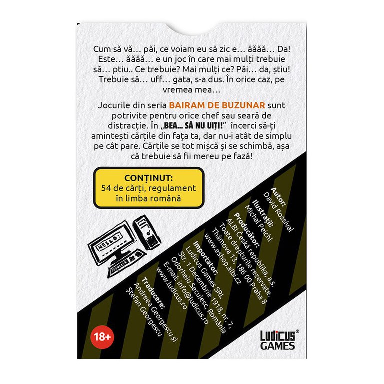 Bea sa nu uiti! este un joc de petrecere din seria BAIRAM DE BUZUNAR, potrivit pentru orice chef sau seara de distractie. In Bea sa nu uiti, incerci sa-ti amintesti cartile din fata ta, dar nu-i atat de simplu pe cat pare!