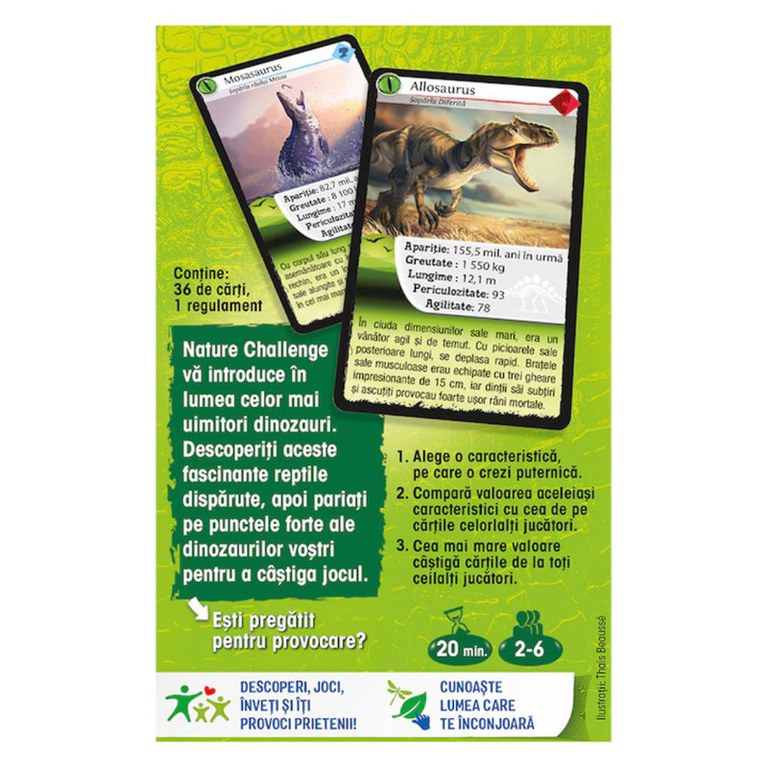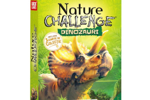 Nature Challenge: Dinozauri te va introduce in lumea celor mai uimitori dinozauri. Descopera aceste reptile fascinante disparute, apoi pariaza pe punctele forte ale dinozaurilor tai pentru a castiga jocul! Esti pregatit pentru aceasta provocare? Cum se joaca:\n1. Alege o caracteristica, pe care o crezi puternica. \n2. Compara valoare aceleiasi caracteristici cu cea de pe cartile celorlalti jucatori.\n3. Cea mai mare valoare castiga cartile de la toti ceilalti jucatori. Editie limba romana.