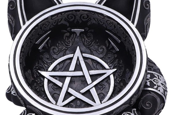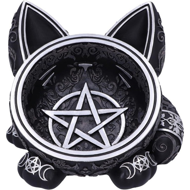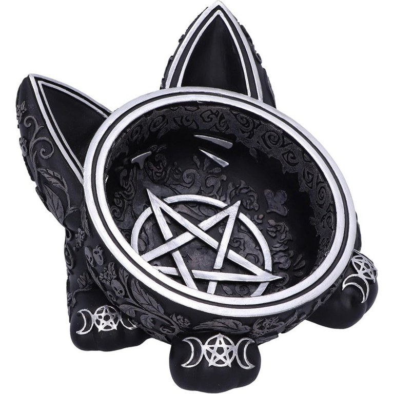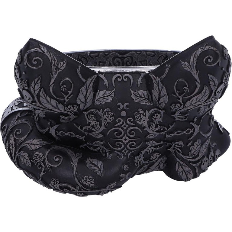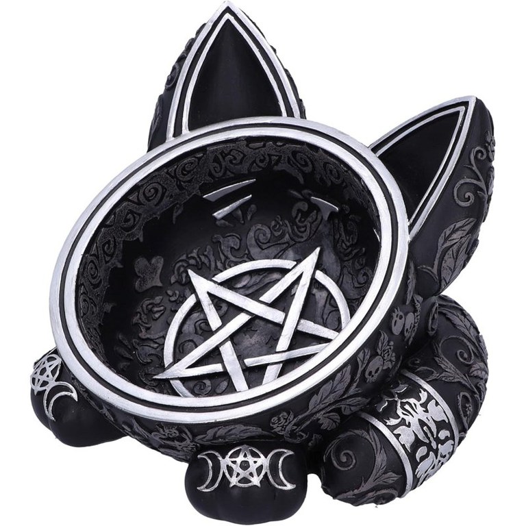 Acest bol unic din colectia de articole pentru casa Nemesis Now este perfect pentru toti pasionatii de pisici gotice si vrajitoare. Bolul magic cu pisica neagra are trasaturi feline proeminente, inclusiv urechi mari, labute dragute si o coada pufoasa. Centrul bolului prezinta un Pentaclu pictat in argintiu, cu modele asortate cu trei luni. Peste tot se regasesc cranii gotice superbe, frunze, trandafiri si decoratiuni cu vita de vie. Accentele argintii adauga o stralucire incantatoare si contrasteaza perfect cu bolul negru mat. Masurand 16 cm, acest bol din rasina este ideal pentru depozitarea bijuteriilor, obiectelor mici sau pur si simplu pentru a adauga o nota de farmec gotic oricarei camere.