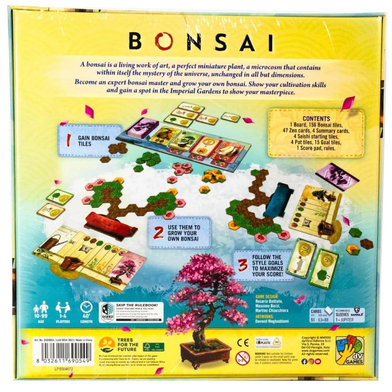 Termenul japonez "bonsai" inseamna "plantat intr-un ghiveci". Un bonsai este o opera de arta vie, o planta miniaturala perfecta, identica in toate privintele cu forma sa in marime naturala, dar de cateva ori mai mica. In Bonsai, jucatorii isi asuma rolul de maestri experti in bonsai, hotarati sa-si cultive propriii bonsai. Cine cultiva cea mai buna planta va fi desemnat sa-si expuna bonsaiul in gradinile imperiale. Cand iti vine randul tau, alege si efectueaza una dintre aceste doua actiuni: mediteaza sau cultiva. Daca meditezi, alege una dintre cartile cu fata in sus de pe tabla si ia-o, impreuna cu orice placute Bonsai reprezentate sub cartea pe care o tragi. Daca alegi sa cultivi, poti plasa in Bonsai placutele care se afla in rezerva ta personala. Poti plasa atatea placute cate simboluri sunt reprezentate pe placuta ta Seishi si pe oricare sau pe toate cartile tale de Crestere. Fiecare simbol iti va permite sa plasezi o placuta de tipul corespunzator. In timpul rundei in care bonsaiul tau indeplineste sau depaseste cerintele unei placute Scop care se afla inca in mijlocul mesei (adica placuta Scop nu a fost inca revendicata de niciun jucator), trebuie sa alegi imediat daca vrei sa revendici acea placuta sau daca vrei sa renunti la ea pentru a incerca sa obtii o placuta cu Scop mai dificila. Cand ultima carte din pachet este dezvaluita, se declanseaza sfarsitul jocului. Fiecare placuta din bonsaiul tau valoreaza un anumit numar de puncte. In jocul solo poti incerca Scenariile Suplimentare care schimba unele reguli si obiective si, in cele din urma, poti incerca sa invingi Provocarea Imparatului.