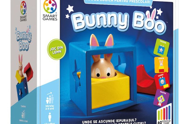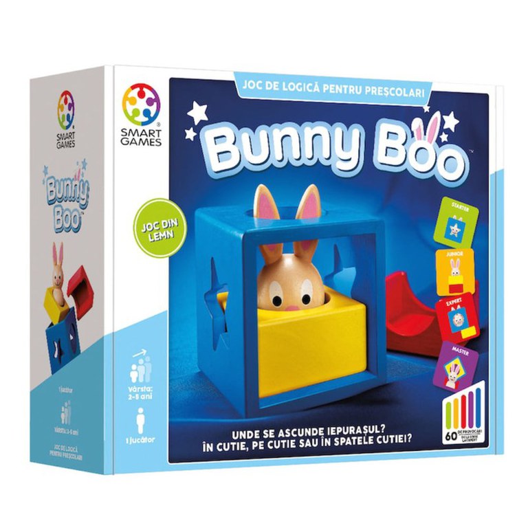 Iepurasul se uita prin gaura rotunda sau prin piesa in forma de stea? Este in picioare pe partea de sus a cubului galben, rosu sau albastru? Cuburile pot fi combinate in diverse moduri, mai multe decat v-ati imaginat. Unele provocari pot parea foarte similare, dar solutia poate fi complet diferita, in functie de cat de departe sunt in afara urechile iepurasului. Copiii pot rezolva 60 de provocari sau se pot juca doar cu o jucarie din lemn.