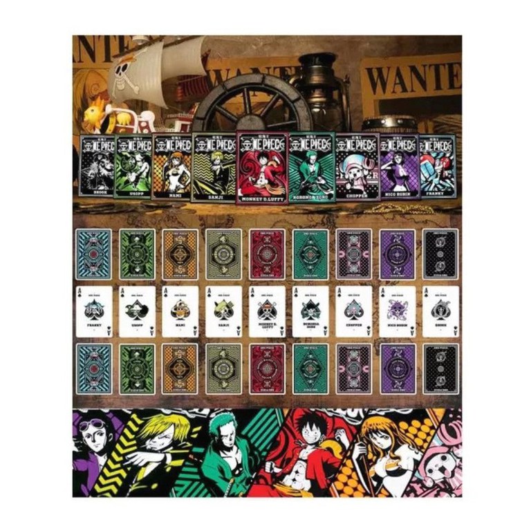 One Piece 9 Decks Set Exclusive Foiled Collection - celebrul anime One Piece este acum disponibil intr-o editie de colectie, limitata la 1500 de bucati. Toata echipa Straw Hat Pirate se regaseste acum in aceste pachete de carti de joc legendare. Setul cuprinde 9 pachete de carti de joc. Cutiile sunt speciale: sunt embosate si cu cerneala metalizata in culorile personajului de pe pachet. Fiecare pachet poarta numele unui personaj din celebrul anime One Piece. Pacheul contine 52 carti de joc si 2 jokeri. Material: carton plastifiat. Dimensiuni: 89 x 65 mm.
