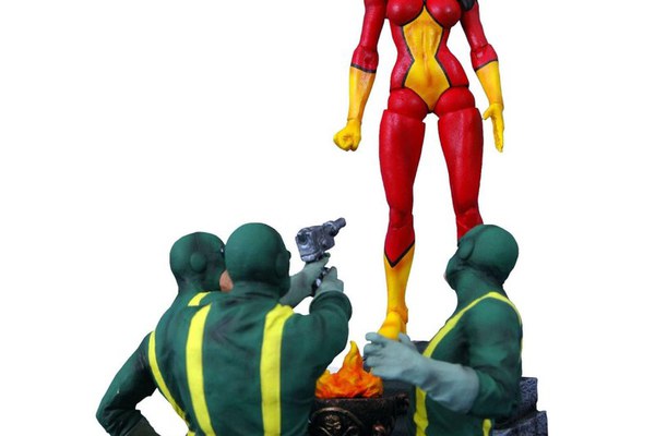 Inzestrata cu super-forta, un atac bioelectric si abilitati de catarare, destinul a condus-o pe Spider-Woman sa se alature echipei New Avengers. Sculptata de Sam Greenwell si avand o inaltime de 18 cm, aceasta figurina articulata prezinta o baza display extrem de detaliata, plus trei figurine partiale cu agenti Hydra pentru a crea o scena dinamica!\n
