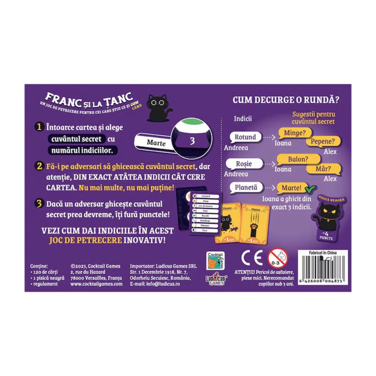 Intoarce cartea si alege cuvantul secret cu numarul indiciilor. Fa-i pe adversari sa ghiceasca cuvantul secret, dar atentie, din exact atatea indicii cat cere cartea. Nu mai multe, nu mai putine! Daca un adversar ghiceste cuvantul secret prea devreme, iti fura punctele! Vezi cum dai indiciile in acest joc de petrecere inovativ!