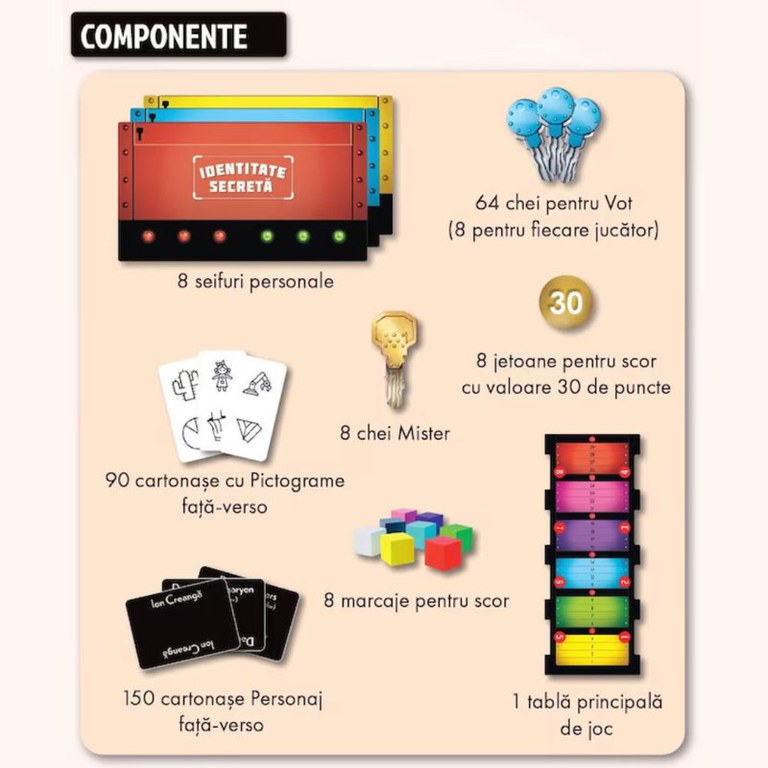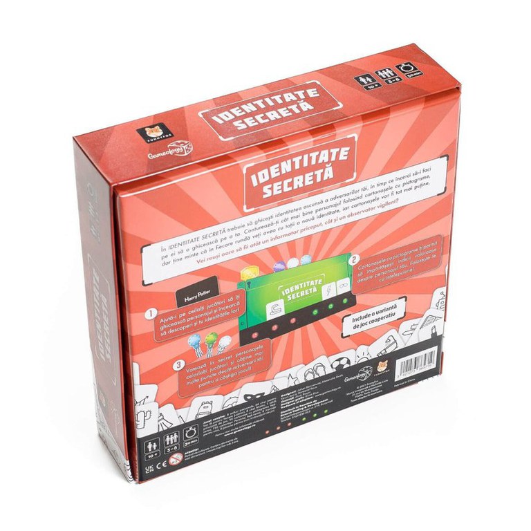 Te-ai gandit vreodata ca poti avea o Identitate Secreta? In acest joc dinamic, va trebui sa ghicesti identitatea ascunsa a celorlalti participanti, dar o vei face in timp ce incerci sa ii faci si pe ei sa o ghiceasca pe a ta. Vei reprezenta un anume personaj despre care vei da indicii cu ajutorul cartonaselor cu pictograme. Totusi, in fiecare runda trebuie sa ai in vedere faptul ca toti jucatorii, inclusiv tu, vor avea o noua identitate, iar cartonasele se vor imputina considerabil. Poti fi un informator priceput, dar si un observator vigilent?\nPersonajul tau va fi conturat de cartonasele cu pictograme, care te vor ajuta sa oferi indicii importante despre personajul tau. Asa ca, fii cu bagare de seama la cartonasele adversarilor tai si acumuleaza cat mai multe puncte votand in secret personajele celorlalti participanti si fii gata de castig.
