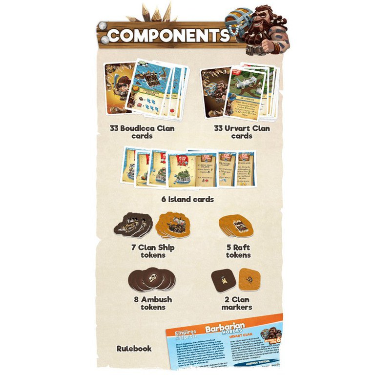 Expansiunea Imperial Settlers: Empires of the North – Barbarian Hordes adauga doua noi clanuri barbare, cu propriile pachete de carti unice, in jocul de baza Empires of the North. Un clan este format din pirati indrazneti care navigheaza pe mare pe plute opulente, in timp ce celalalt clan este plin de talhari notorii care saboteaza alte clanuri si cer rascumparare. Barbarian Hordes este o expansiune si necesita jocul de baza Imperial Settlers Empires of the North.