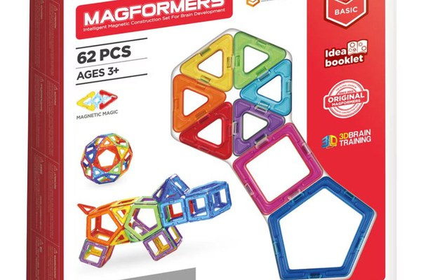Jocul magnetic de constructie Magformers - 62 piese este compus din 20 triunghiuri, 30 patrate si 12 pentagoane magnetice, in culori stralucitoare de curcubeu. Este setul perfect care va introduce in lumea magica, magnetica creata de Magformers, dar este si un supliment minunat pentru oricare alt set din colectie.\n\nProvocarea suplimentara consta in testarea capacitatilor copiilor, deoarece doar anumite parti ale componentelor contin magneti! Toate piesele sunt 100% compatibile cu alte seturi Magformers.