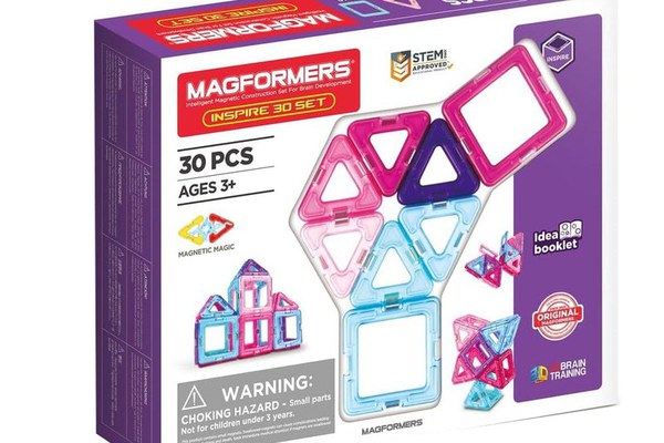 Jocul magnetic de constructie Magformers - 30 piese este compus din 12 triunghiuri si 18 patrate magnetice, in culori stralucitoare de curcubeu. Este setul perfect care va introduce in lumea magica, magnetica creata de Magformers, dar este si un supliment minunat pentru oricare alt set din colectie.\n\nProvocarea suplimentara consta in testarea capacitatilor copiilor, deoarece doar anumite parti ale componentelor contin magneti! Toate piesele sunt 100% compatibile cu alte seturi Magformers.
