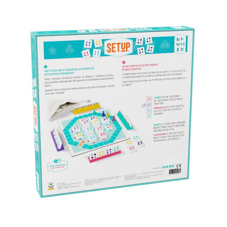 SetUp este un joc simplu, potrivit pentru serile petrecute impreuna cu familia sau prietenii! Combina suite si numere pe tabla de joc pentru a obtine puncte... o multime de puncte! Si ai grija sa nu iti lasi adversarii sa castige! Joaca impotriva prietenilor, a familiei sau formati echipe pentru un joc tactic! Fie ca alegeti sa jucati individual sau in echipa, SetUp este jocul ideal pentru o seara distractiva si plina de surprize!