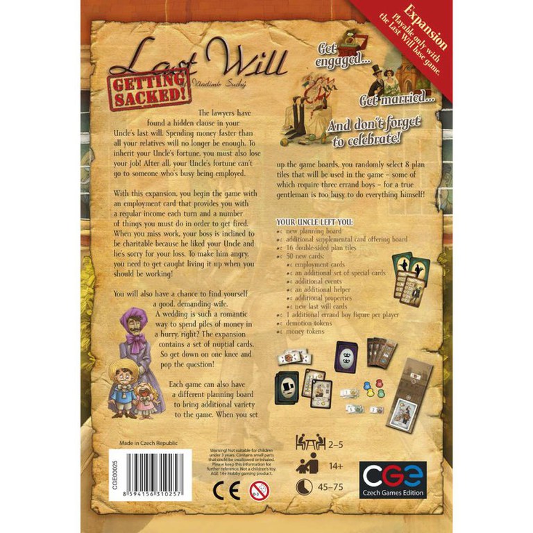 In ultimul sau testament, un unchi bogat a decis sa isi lase mostenirea nepotului care demonstreaza ca se bucura cel mai mult de bani. Odata cu aceasta extensie, mai apare un obstacol care trebuie depasit: slujba! Desi incepi ca un angajat de succes, trebuie sa faci tot posibilul sa devii somer pana la finalul jocului, altfel nu vezi nici un sfant din mostenire! Getting Sacked este o extensie si necesita jocul de baza Last Will.