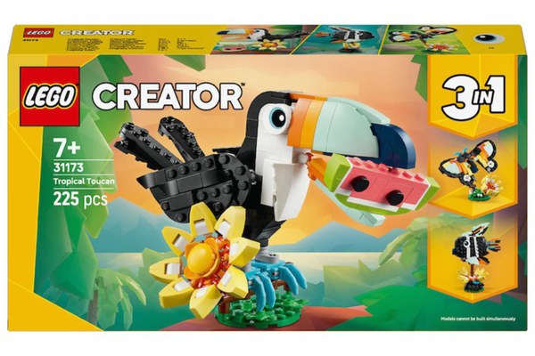 Bucura-te de distractie tropicala cu minunatul set de constructie LEGO Creator 3 in 1 Animale salbatice: Tucan tropical (31173). Pasarea de jucarie LEGO sta pe o creanga acoperita cu o floare mare din caramizi si are o felie de pepene verde. Pentru mai multa valoare de joaca, pasarea isi poate misca aripile, ciocul si penele cozii. Copiii au 3 optiuni de constructie a setului cu animale LEGO folosind aceleasi caramizi: un tucan articulat cu o felie de pepene verde care poate fi asezata in ciocul acestuia, un fluture colorat cu aripi articulate, care zboara deasupra suportului sau reprezentand un petic cu iarba si o floare, si un peste tropical cu inotatoare articulate care se pot roti la 360 de grade pe un suport reprezentand fundul marii. Seturile LEGO Creator 3 in 1 inspira creativitatea copiilor prin 3 modele diferite de asamblat in fiecare cutie. Copiii vor fi incantati sa le construiasca si sa le reconstruiasca iar si iar. Seturile 3 in 1 ofera o gama care raspunde celor mai mari pasiuni ale celor mici, incluzand vehiculele super rapide, animalele uimitoare si casele. Numar piese: 225.