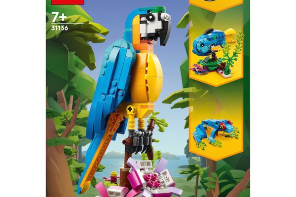 Micii constructori si pasionatii de animale de 7+ ani vor strabate padurea tropicala pentru povesti pline de actiune cu setul de constructie LEGO Creator 3 in 1 Papagal exotic (31136). Setul include un papagal colorat, care isi poate roti complet corpul in timp ce sta pe o ramura de copac si-si misca aripile si coada. Jucarii 3 in 1 care initiaza distractia creativa\nCu acest fantastic set LEGO 3 in 1, copiii au ocazia sa construiasca 3 animale exotice diferite. Ei pot construi un papagal colorat care sta pe o ramura de copac sau pot reconstrui papagalul intr-un peste jucaus care inoata pe fundul marii sau intr-o broasca neobrazata care-si poate misca labele. O experienta digitala distractiva pentru fanii LEGO\nDescarca aplicatia LEGO Builder si patrunde intr-o noua lume a construitului distractiv, in care copiii isi pot apropia si roti modelele in 3D, pot salva seturi si isi pot monitoriza progresul. Numar piese: 253.