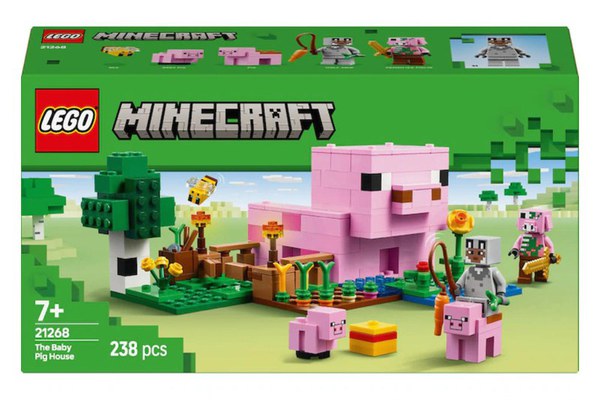 Casa-Purcelus (21268) este jucaria ideala pentru jucatorii Minecraft pasionati de construitul de case, animale si ferme. Aceasta jucarie Minecraft interactiva, inspirata de universul gaming, este un cadou grozav de zi de nastere, de sarbatori sau oricand, pentru baieti, fete si copii de 7+ ani. Cu actiunea plasata in biomul padure din Minecraft, aceasta jucarie creativa in care construiesti o casa include multe figurine din popularul joc video: un personaj erou intr-o piele de lup, un purcelus, o albina, un porc adult si un piglin zombificat. Copiii pot reproduce actiunea din joc, cum ar fi sa puna saua pe porcul adult si sa-i vanture un morcov prin fata pentru a face o plimbare prin casa si gradina in forma de porc. Exista o parcela cu cartofi si sfecla de crescut si un camp cu o poarta prin care purcelusul sa fie manat. Copiii pot evita piglinul zombificat, care vrea sa strice distractia, intrand in casa, unde exista un pat, o biblioteca si o masa de lucru care sa inspire joaca fantezista. Aplicatia LEGO Builder le ofera copiilor distractie suplimentara, acestia putandu-si folosi dispozitivul pentru a apropia si roti modelele in 3D. Numar piese: 238.
