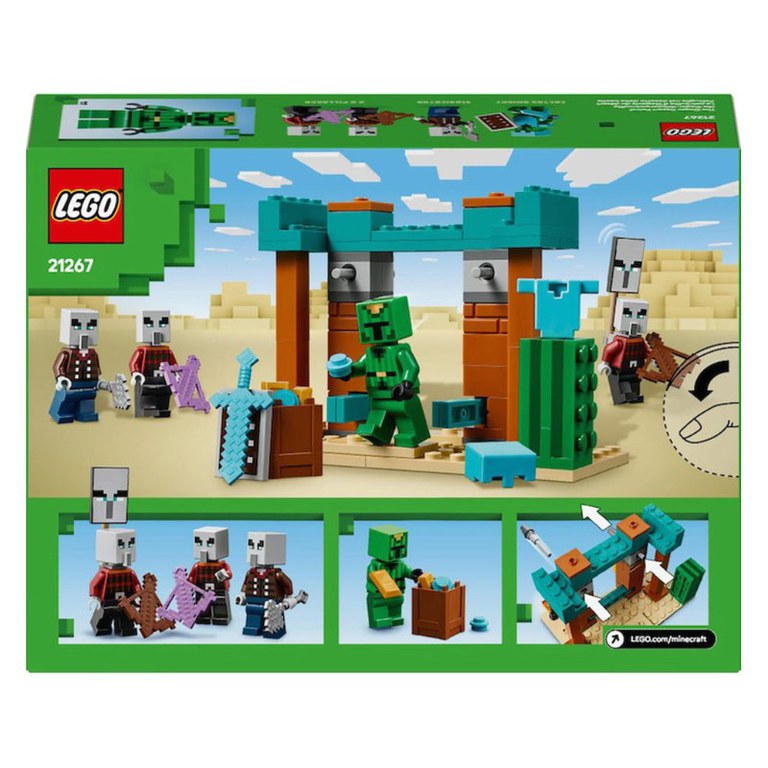 Multa distractie ii asteapta pe jucatorii Minecraft in acest mic set LEGO pentru copii de 7+ ani. Cu 4 figurine LEGO Minecraft, dotari distractive si accesorii autentice, Patrula Illager de desert (21267) este o jucarie mica cu actiune Minecraft de mari proportii. Aflati intr-un avanpost dintr-un desert Minecraft, copiii joaca rolul unui Cavaler Cactus, cu armura, scutul si sabia sa de diamant. Cand 3 figurine illager sosesc pentru a fura comori, copiii trebuie sa apere avanpostul. Setul include proiectile pe care cei mici le pot lansa cu un bobarnac al degetului, o varietate de arme si un butoi care contine comoara. Pentru un plus de distractie digitala, aplicatia LEGO Builder le permite copiilor sa apropie si sa roteasca modelele in 3D folosindu-si dispozitivele. Numar piese: 105.