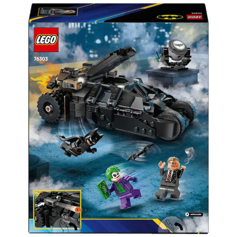 Batman Tumbler vs Two-Face si Joker (76303) este o jucarie distractiva pentru copiii pasionati de Batman, vehicule, creativitate LEGO si aventuri cu supereroi. Plaseaza actiunea cu vehiculul lui Batman in mainile micilor supereroi de 8+ ani cu acest set LEGO de calitate superioara, care include emblematicul vehicul Tumbler Batmobile din filmele clasice cu Cavalerul Negru. Acest set cu supereroi LEGO Batman include 3 minifigurine populare: Batman inarmat cu arma sa Batarang, Joker tinand in mana un teanc de bani si Two-Face cu moneda sa distinctiva de argint. Vehiculul construibil Tumbler Batmobile se deschide pentru a dezvalui un panou de instrumente si un cockpit cu spatiu pentru Batman. Un element flacara detasabil iese din teava de esapament a vehiculului. Proiectorul Bat-Signal (nu se aprinde) se inclina si se roteste 360 de grade in ambele directii. Pentru mai multa distractie digitala, constructorii pot apropia si roti modelele in 3D si isi pot urmari progresul folosind aplicatia distractiva si intuitiva LEGO Builder. Numar piese: 429.