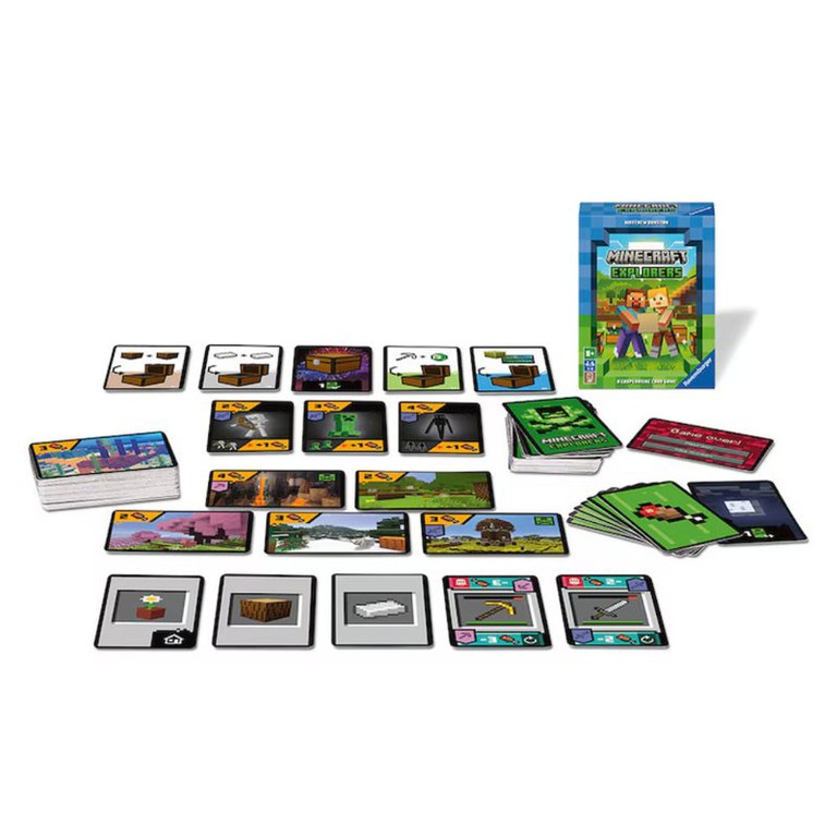 Minecraft Explorers este un joc de carti cooperativ din universul "Minecraft"! Impreuna, jucatorii exploreaza peisaje inspirate din celebrul joc video si cauta comori ascunse. Ei pot folosi unelte, se pot apara de monstri si trebuie sa isi gestioneze cu atentie numarul limitat de actiuni. Scopul este sa isi umple cuferele cu comorile cautate, dar daca monstrii devin prea numerosi, jocul se termina. Fiecare jucator are un numar de puncte de actiune pe tura, pe care le poate folosi pentru a explora locuri noi si a descoperi ce se afla pe spatele cartilor. Tarnacoapele si sabiile ii ajuta la unele explorari.   Cu o strategie buna si un pic de noroc, echipa poate gasi comorile necesare pentru a castiga.   Totusi, trebuie sa fie atenti la monstri precum zombi, creeperi si endermeni, la sfarsitul fiecarei ture trebuie dezvaluita o carte de monstru. Daca un monstru este deja in joc, vor aparea mai multi monstri, iar echipa risca sa piarda. Jucatorii trebuie sa infrunte hoardele cu curaj, deoarece jocul se termina daca toate cartile de monstri sunt folosite.\n