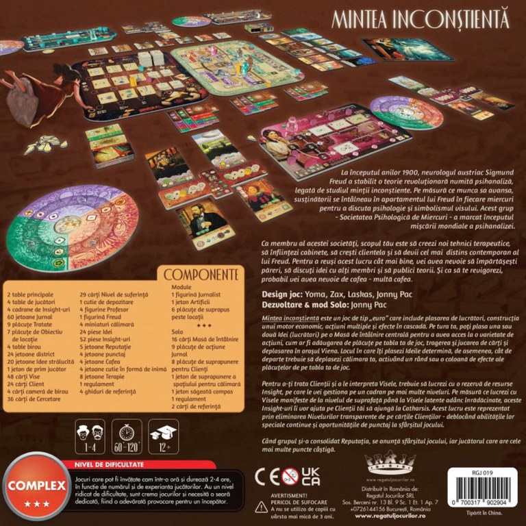 La inceputul anilor 1900, neurologul austriac Sigmund Freud a stabilit o teorie revolutionara numita psihanaliza, legata de studiul mintii inconstiente. Pe masura ce munca sa avansa, sustinatorii se intalneau in apartamentul lui Freud in fiecare miercuri pentru a discuta psihologie si simbolismul viselor. Grupul numit Societatea Psihologica de Miercuri a marcat inceputul miscarii mondiale a psihanalizei. Ca membru al acestei societati, scopul tau este sa creezi tehnici terapeutice noi, sa infiintezi cabinete, sa cresti clientela si sa devii cel mai distins contemporan al lui Freud. Mintea inconstienta este un joc de tip euro care include plasarea de muncitori, constructia unui motor economic, actiuni multiple si efecte in cascada. Cand grupul si-a consolidat Reputatia, se anunta sfarsitul jocului, iar jucatorul care are cele mai multe puncte castiga.