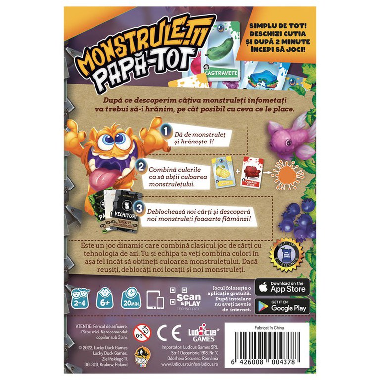Monstruletii Papa-Tot este un joc de carti cooperativ, protrivit pentru seri cu familia, de potrivire a culorilor si hranire a monstrilor.\n\nSe aud zgomote ciudate din podul casei de vara a bunicului tau. Dupa ce ai urcat scarile, vezi peste tot monstri colorati si imblaniti! Par a fi prietenosi, dar le este foarte foame! Trebuie sa-i hranesti cu tot ce poti gasi. Vor manca orice, dar ceea ce ii atrage cel mai mult este culoarea obiectelor! Scopul tau la fiecare nivel este sa hranesti toti monstrii cu alimentele care le plac, in functie de culoarea blanii lor.