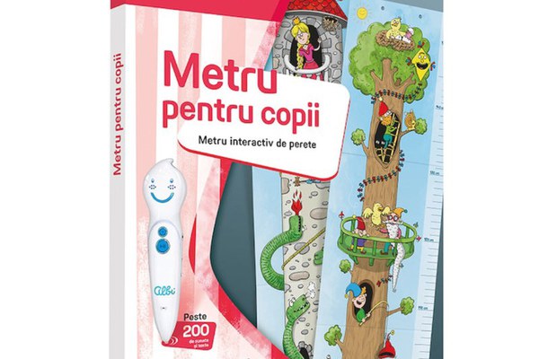 Metrul de perete cu doua fete nu doar ca masoara inaltimea copiilor, ci le face cunostinta si cu lumea basmelor. Pe o parte, ei vor fi fascinati de printul care salveaza printesa si balaurul din ghearele maleficului cavaler Bastian cel Teribil si, pe cealalta parte, de un copac locuit de spiridusi. Ce personaje ii vor insoti pe copiii depinde doar de ei. Pe langa inaltimea masurata, metrul ne spune ceva in plus la fiecare cinci centimetri, iar copiii pot asculta o melodie pe fundal. Varsta: 3 - 7 ani. Cartea nu include Creionul Electronic Raspundel Istetel, acesta se vinde separat.