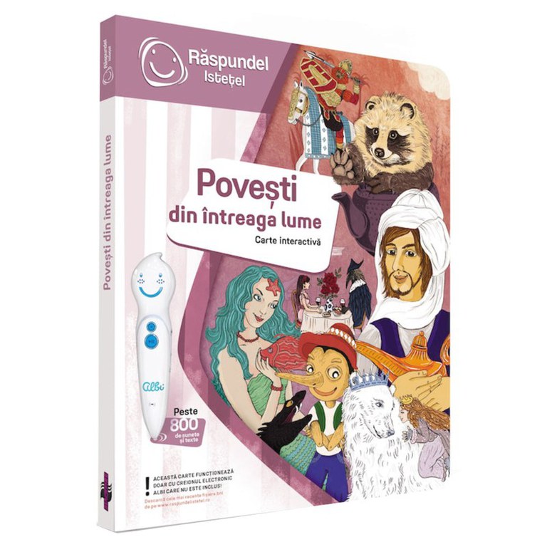 Aceasta carte cuprinde opt povesti din diferite colturi ale lumii si va aduce, nu doar basme cunoscute precum Frumoasa si Bestia, Lampa lui Aladin sau Mica Sirena, ci si povesti mai putin cunoscute care va vor incanta si stimula imaginatia. Descoperiti o tara nordica acoperita de zapada impreuna cu Regele Urs, vizitati Japonia cu povestea Cana fermecata, explorati continentul african impreuna cu Samba fricosul si strabateti India alaturi de Printul Sarpe. Cartea nu include Creionul Electronic Raspundel Istetel, acesta se vinde separat.