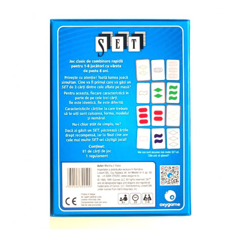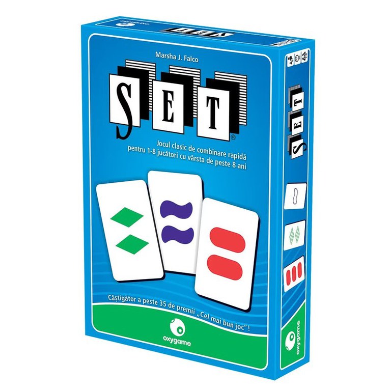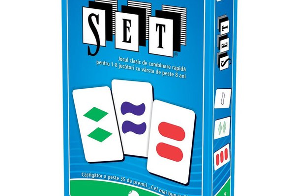 SET este unul dintre cele mai premiate jocuri din toate timpurile! \n\nIntreceti-va sa gasiti cat mai multe SET-uri, iar jucatorul cu cele mai multe SET-uri la sfarsitul jocului castiga! Te poti juca singur sau cu cati jucatori incap in jurul mesei! Este perfect pentru calatorii, petreceri sau ca joc rapid dupa cina. Cu miscari rapide si multa distractie, SET este perfect pentru orice intalnire cu familia si prietenii! Poate fi jucat de toata lumea, dar nimeni nu se poate opri! Desi realizat ca un joc distractiv, SET are si valoare educationala. Antreneaza-ti creierul in timp ce joci!\n\nCe reprezinta un SET?\n\nUn set reprezinta trei carti in care fiecare caracteristica, luata in mod individual, este fie la fel, fie diferita. Fiecare carte contine patru caracteristici: culoare (rosu, violet sau verde), forma (ovala, curbata sau diamant), numar (unu, doi sau trei) si model (solid, in dungi sau contur).