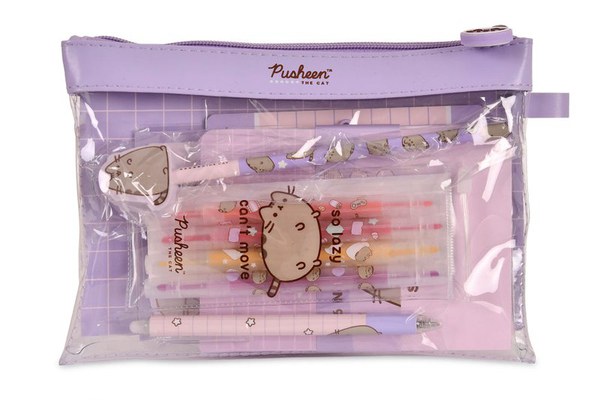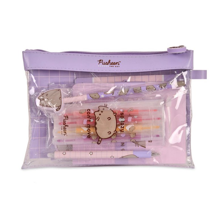 Aceasta trusa adorabila contine mai multe accesorii de papetarie in culorile lui Pusheen. Include: trei caiete A6, un creion cu radiera, doua agrafe de birou, un pachet cu sticky notes, patru markere colorate, doua foi cu stickere si un pix, toate intr-un penar de plastic transparent.