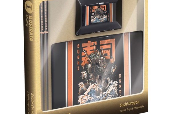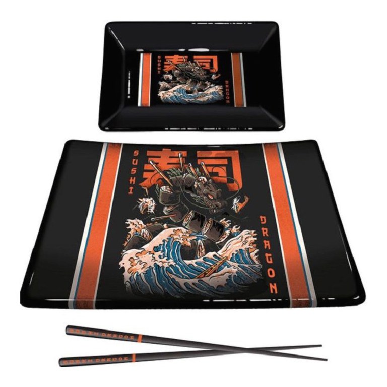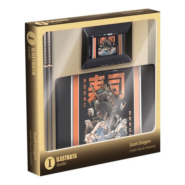 Setul include un platou mare si unul mic pentru sushi si o pereche de betisoare asortate pentru o servire retro a celui mai cunoscut fel de mancare din Japonia. Designul este realizat dupa ilustratia "Great Ramen Wave" a artistului Vincent Trinidad. Dimensiuni pachet: 27 x 24 x 3,5 cm.