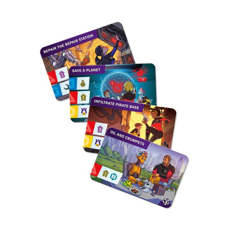 In acest joc de tip Euro, pentru 1-4 jucatori, care combina mecanicile de alegere a actiunii si engine building, vei gestiona o echipa diversa de cadeti, ofiteri si androizi, fiecare avand roluri si capacitati speciale diferite. Castigand medalii, iti poti promova si antrena echipajul pentru o eficienta si mai mare. In mod similar, iti poti imbunatati nava cu o tehnologie puternica de constructie a motoarelor pentru o sinergie maxima. Ce vei face cu acest echipaj si cu o nava imbunatatita? Exploreaza o galaxie in continua schimbare plina de pirati periculosi si misiuni interplanetare pentru a-ti spori reputatia cu trei factiuni galactice distincte pentru a obtine recompense generoase.