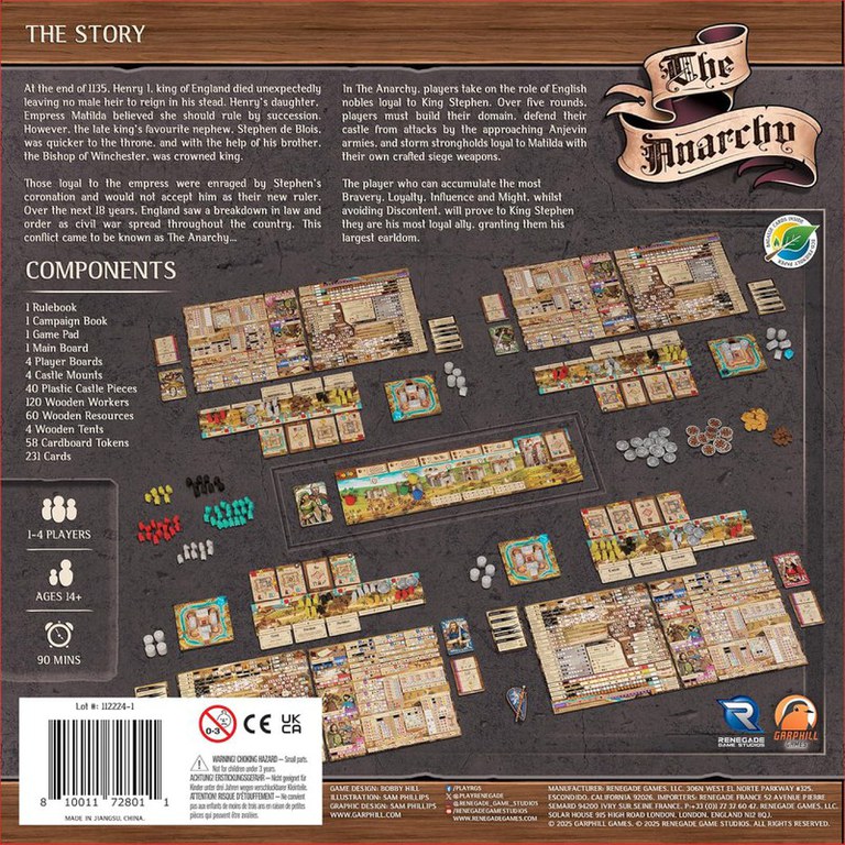La sfarsitul anului 1135, Henric I, regele Angliei, a murit pe neasteptate, fara a lasa un mostenitor care sa domneasca in locul sau. Fiica lui Henric, imparateasa Matilda, credea ca ar trebui sa domneasca prin succesiune. Cu toate acestea, nepotul favorit al regretatului rege, Stephen de Blois, a ajuns mai repede la tron si, cu ajutorul fratelui sau, episcopul de Winchester, a fost incoronat rege. Cei loiali imparatesei au fost infuriati de incoronarea lui Stephen si nu l-au acceptat ca nou conducator. In urmatorii 18 ani, Anglia a cunoscut o prabusire a legii si a ordinii, pe masura ce razboiul civil s-a raspandit in toata tara. Acest conflict a ajuns sa fie cunoscut sub numele de Anarhia. In jocul The Anarchy, jucatorii preiau rolul nobililor englezi loiali regelui Stephen. Pe parcursul a cinci runde, jucatorii trebuie sa-si construiasca domeniul, sa-si apere castelul de atacurile armatelor anjevine care se apropiau si sa ia cu asalt cetatile loiale Matildei cu propriile arme de asediu create. Jucatorul care poate acumula cel mai mult Curaj, Loialitate, Influenta si Putere, evitand in acelasi timp Nemultumirea, ii va dovedi Regelui Stephen ca este cel mai loial aliat al sau, acordandu-i cel mai mare titlu de comitat.