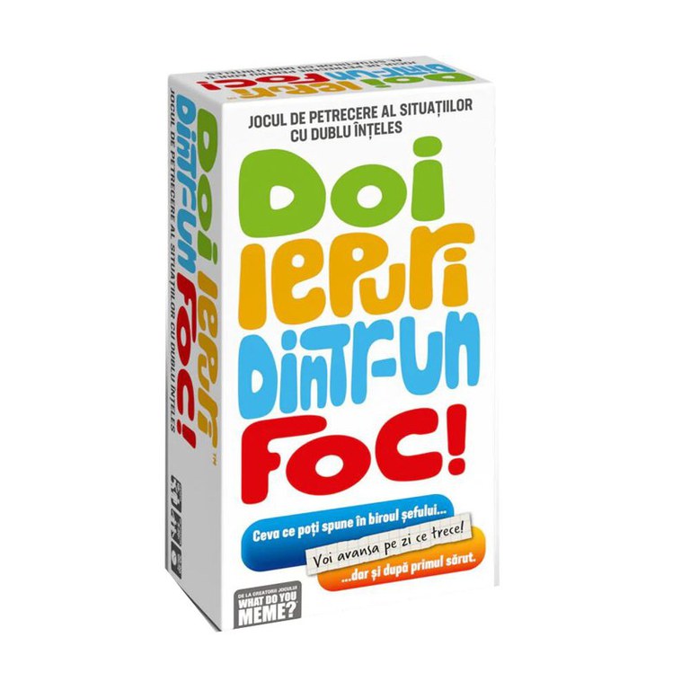 Jocul include un set de carti cu imagini si un set de carti cu cuvinte. Scopul jocului este de a gasi cele mai bune combinatii intre cartea cu imagine si cea cu cuvant. Fiecare carte cu imagine prezinta o scena sau o situatie, iar jucatorii trebuie sa aleaga o carte cu cuvant care se potriveste cel mai bine cu imaginea. Creativitatea si simtul umorului sunt cheia acestui joc, deoarece combinatiile pot fi amuzante si neprevazute. Jucatorii trebuie sa gandeasca rapid si sa aleaga cele mai interesante si ingenioase combinatii pentru a castiga runde si a aduna puncte. Doi iepuri dintr-un foc este un joc potrivit pentru petreceri, reuniuni de familie sau seri de distractie alaturi de prieteni. Este un mod excelent de a provoca rasete si de a aduce o atmosfera plina de divertisment in jurul mesei. Contine: 175 de carti albastre, 175 de carti rosii, 8 carti whiteboard, 8 markere scrie-sterge, regulament in limba romana. Nr jucatori: 3-20.