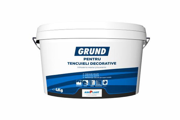 Grund pentru tencuieli decorative - Grund Adeplast Produs special pentru aplicare preliminar tencuielilor decorative pe baza de rasini sintetice in dispersie apoasa rasina siliconica precum si tencuiala decorativa de soclu pe suporturi minerale in scopul reducerii si egalizarii absorbtiei pentru imbunatatirea aderentei. Produsul se coloreaza in nuanta apropiata tencuielii decorative Adeplast. Produsul se aplica la interior si exterior in sistem de finisaj profesional. Stratul suport: Grundul de amorsare se aplica pe suprafete plane curate si rezistente. Eventualele diferente de planeitate se rectifica prealabil aplicarii produsului. Suprafata nu trebuie sa prezinte materiale ce pot forma un strat separator (de exemplu uleiuri sau altele asemenea). Suporturile in special cele din beton trebuie sa aiba o umiditate reziduala sub 2 5%. Suprafetele de termosistem cu denivelari se corecteaza prealabil cu ADEPLAST Polistirol Premium. Suprafetele de beton cu denivelari se corecteaza preabil cu sistemul Schomburg de reconditionare beton. Suprafetele de tipul tencuielilor cu denivelari se corecteaza prealabil cu ADEPLAST MTe35. In functie de situatie se realizeaza prealabil hidroizolatiile necesare in special in zona de soclu pe sistem termoizolant. In decursul aplicarii si uscarii temperatura aerului si suportului nu trebuie sa scada sub 5°C sau sa creasca peste 25°C. Punere in opera:Produsul poate fi diluat cu maxim 1 litru de apa curata la o galeata de 24 kg respectiv 0 2 l la 4 kg. Produsul se aplica omogen cu trafaletul.In conditii normale de temperatura si umiditate respectiv 20°C si 65% timpul de uscare este de cca. 24 de ore. In conditii de umiditate ridicata sau temperaturi scazute timpul de uscare al straturilor aplicate creste.