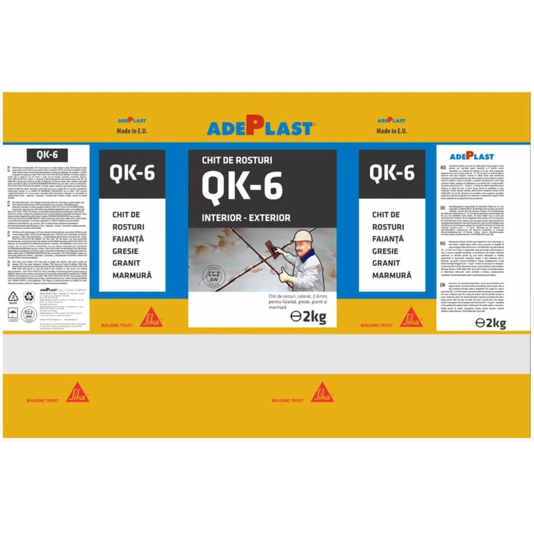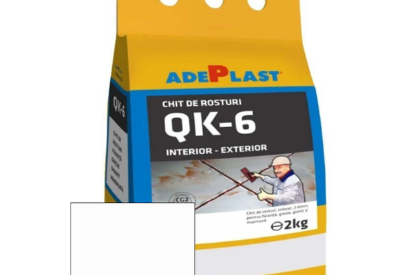 Adeplast Chit de rosturi Alb-Quarz 2 KGQK6 de la Adeplast este un chit de rosturi recomandat pentru rosturile cu grosimi cuprinse intre 2-6 mm.Acesta are aplicabilitate usoara rezistenta foarte buna la intemperii este flexibil impermeabil si se poate utiliza atat la interior cat si la exterior.Mortar pentru rostuire placare ceramica CG2 WA conform SR EN 13888 / 2009 pentru aplicare la interior si exterior pe suprafete expuse la temperaturi intre – 20°C si 80°C cu sau fara umiditate pentru rosturi de dimensiuni mari. Produsul se aplica numai pe suporturi minerale precum placi ceramice gresie marmura piatra naturala ce nu prezinta risc de decolorare gresogranit gresie portelanata mozaic.Produsul nu se aplica pe suporturi din lemn plastic metal etc. Nu se utlizeaza pentru umplere rosturi active zone expuse la substante chimice si suprafete expuse la deformare.Caracteristici:rezistenta ridicata la intemperiiaderenta ridicataprelucare usoarastablitatea culorii in timpambalaj etans / depozitare de lunga durata 2 ani