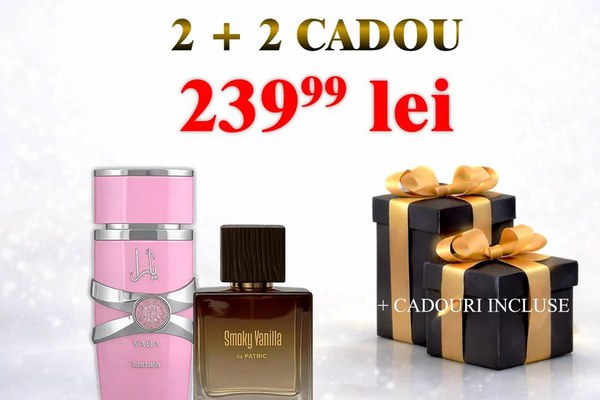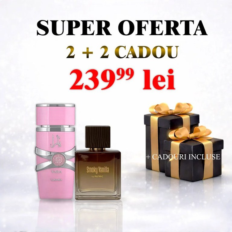 Pachet Apa de parfum Yara by Lattafa + Apă de parfum Smoky Vanilla by Patric, unisex + 2 parfumuri cadou ? Ce conține pachetul YARA by Lattafa parfums este un spray de parfum cu adevarat exclusiv. Parfum pentru femei, potrivit pentru toate ocaziile. Parfumul este cu adevarat unic si magic si de lunga durata. Compozitie olfactiva: Note de varf: portocaliu, mandarina. Note de mijloc: note florale, trandafir. Note de baza: iasomie, note fresh, note florale Inspirat de renumitul ** Tobacco Vanille **, acest parfum se remarcă prin eleganța sa clasică și farmecul atemporal. Compoziția parfumului: - Note de vârf : Un amestec vibrant de condimente calde și tonuri lemnoase, care te întâmpină cu o căldură reconfortantă și intrigantă. - Note de mijloc : O inimă bogată și cremoasă de vanilie naturală, completată de accente subtile de tutun dulce și balsamic, adăugând profunzime și intensitate parfumului. - Note de bază : O bază sofisticată de lemn de santal și boabe de tonka, care persistă pe piele și îți oferă o prezență magnetică, greu de uitat. Smoky Vanilla by Patric este parfumul ideal pentru cei care apreciază luxul și complexitatea unui parfum bine echilibrat, perfect pentru ocazii speciale sau pur și simplu pentru a-ți adăuga un plus de rafinament în fiecare zi. Fiecare pulverizare te va învălui într-o aură de mister și eleganță, lăsând o impresie memorabilă oriunde ai merge. 2 parfumuri CADOU – ideale pentru a descoperi arome noi sau pentru a fi oferite mai departe ? Total: 4 parfumuri într-un pachet avantajos