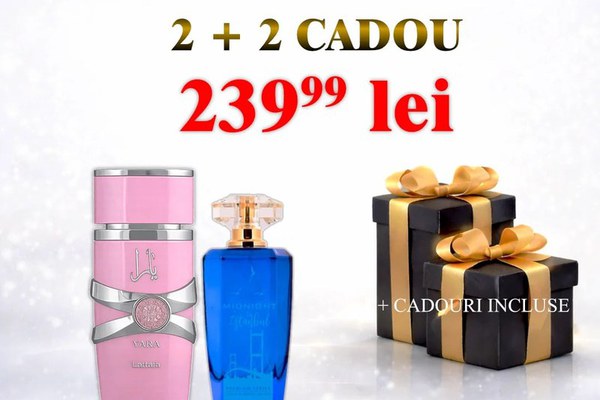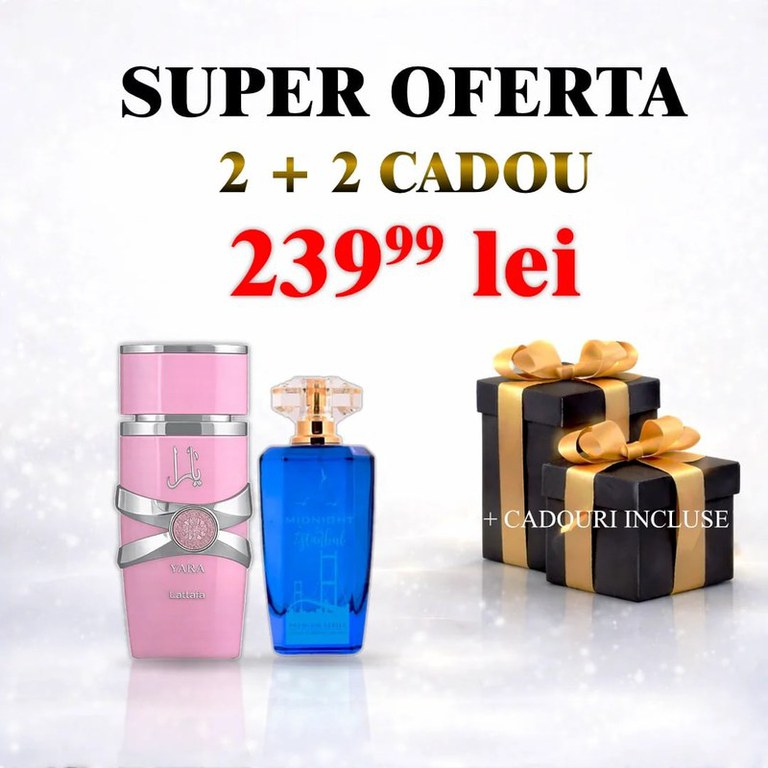 Pachet Apa de parfum Yara by Lattafa + Midnight in Istanbul by Patric + 2 parfumuri cadou ? Ce conține pachetul YARA by Lattafa parfums este un spray de parfum cu adevarat exclusiv. Parfum pentru femei, potrivit pentru toate ocaziile. Parfumul este cu adevarat unic si magic si de lunga durata. Compozitie olfactiva: Note de varf: portocaliu, mandarina. Note de mijloc: note florale, trandafir. Note de baza: iasomie, note fresh, note florale Evadează în aromele ademenitoare, puternice si dulci și rasfață-ți simțurile în profunzime cu opulența notelor florale. Un parfum floral, decadent, fin. Inspirat din YSL - Supreme Bouquet Nota de varf: Fructe, pere, piper Nota de inimă: Ylan- Ylang, iasomie, tuberoză Nota de bază: Chihlimbar, alge marine, patchouli 2 parfumuri CADOU – ideale pentru a descoperi arome noi sau pentru a fi oferite mai departe ? Total: 4 parfumuri într-un pachet avantajos