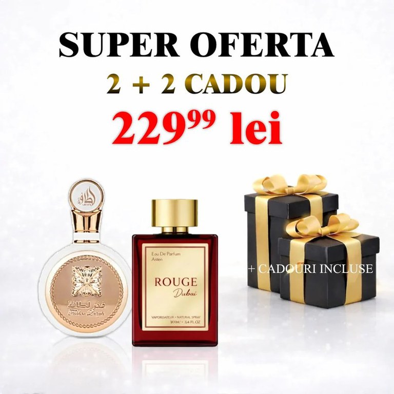 Pachet Lattafa Fakhar Woman+Rouge Dubai + 2 parfumuri cadou Un pachet atent ales pentru cei care apreciază arome elegante, moderne și ușor recognoscibile , într-o combinație echilibrată de rafinament și senzualitate. Două parfumuri premium, completate de două parfumuri cadou , pentru varietate și valoare maximă. ? Ce conține pachetul Conform experiențelor clienților, Fakhar Woman este asemănător cu L`Interdit de la Givenchy. Ingrediente Note de vârf : bergamotă, crin, rodie Note de mijloc : trandafir, iasomie, caprifoi, tuberoză, bujor, gardenie Note de bază : vanilie, lemn de santal, ambroxan, mosc alb Descoperă farmecul acestui captivant parfum, Cute Lady by Asten! Cute Lady de la Asten este un parfum fermecător care sporește feminitatea și dulceața femeii moderne. Notele sale proaspete și jucăușe evocă o imagine radiantă plină de energie. Bucurați-vă de fructele sale suculente, florile moi și o notă de senzualitate de durată. Rouge Dubai este un parfum care întruchipează pasiunea și misterul. Perfect pentru cei care doresc să iasă în evidență și să lase o impresie de durată, acest parfum te învăluie într-o aură seducătoare și enigmatică. Cu fiecare aplicare, dezvăluie esența seducției de foc, evocând un sentiment de putere și magnetism irezistibil ? Note de varf: migdala amara, sofran ? Note de mijloc: iasomie egipteana, cedru ? Note de baza: note lemnoase, mosc 2 parfumuri CADOU – ideale pentru a descoperi arome noi sau pentru a fi oferite mai departe ? Total: 4 parfumuri într-un pachet avantajos