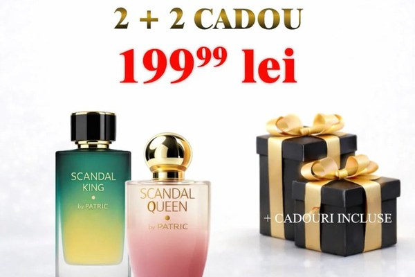 ✨ Pachet Super Promo 2 + 2 cadou ✨ Cumperi 2 Primesti 4 Primești 2 PARFUMURI de 100 ml Cadou Surpriză la achiziționarea acestui pachet exclusiv! ______________________________________________________________________________________ Scandal Queen by Patric Apa de parfum Scandal intruchipeaza feminitatea. Ciprat cu miere. Scandal este o supradoza de placere, un nou tip de parfum pentru femei. O miere delicios combinata cu eleganța gardeniei și cu patchouli senzual: o adictie marca Frederic Patric. Scandal este o sticla super-chic cu un parfum original. Parfumul este feminin, intim, de culoare roz pudra. Nota de start: gardenie Note de baza: paciuli Note de mijloc: miere ___________________________________________________________ Scandal King by Patric Pășește într-o lume care te încurajează să-ți continui drumul sub un cer albastru închis acoperit de stele... Compoziția magnifică, care se deschide cu tonuri de citrice strălucitoare și note aromate, împodobite cu boabe de tonka și caramel, toate oferind un echilibru unic impreuna cu căldura aurie a chihlimbarului din bază. Nota de varf: salvie, mandarina, portocala, lavanda Notă de inimă: caramel, boabe de tonka, iasomie Note de baza: ambra, paciuli, lemnos