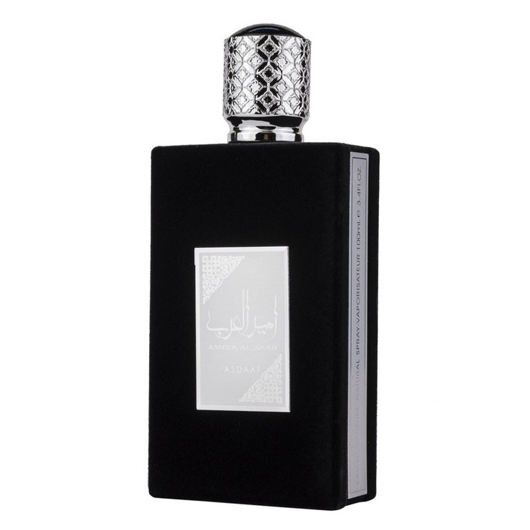 Ameer Al Arab Black este un parfum care debutează cu note răcoritoare, devine ușor dulceag în arome de iasomie și lemn de santal și se așează cu unde misterioase și senzuale în acorduri de ambră și mosc. Ingrediente Note de vârf: frunze de mentă, busuioc, cardamom Note de mijloc: iasomie, caprifoi, lavandă, șofran, piper Note de bază: lemn de cedru, lemn de santal, patchouli, mosc, ambră Despre fazele unui parfum: PRIMA IMPRESIE sau notele de vârf Se simt imediat după aplicare și persistă până la 10 - 20 minute în funcție de PH-ul pielii fiecăruia. INIMA PARFUMULUI sau notele de mijloc Își fac apariția după aproximativ 20 de minute și persistă în jur de o ora. Acestea exprimă esența parfumului. LONGEVITATEA sau notele de bază Persistă cel mai mult și sunt constituite din esențele de ulei care nu se evaporă sau nu sunt volatile. 90% din parfumurile arăbești persistă între 5 si 24 ore pe piele.